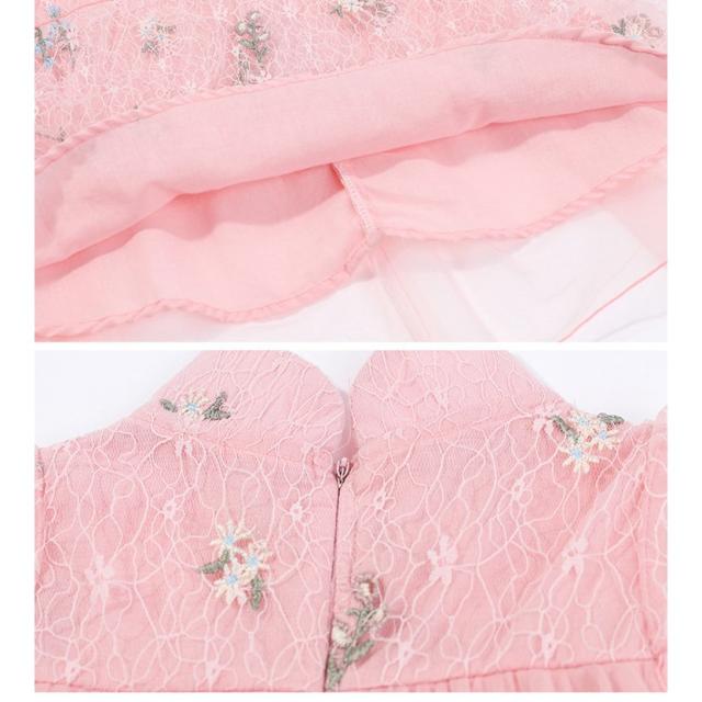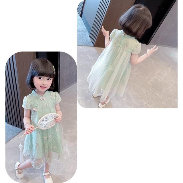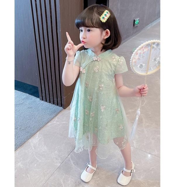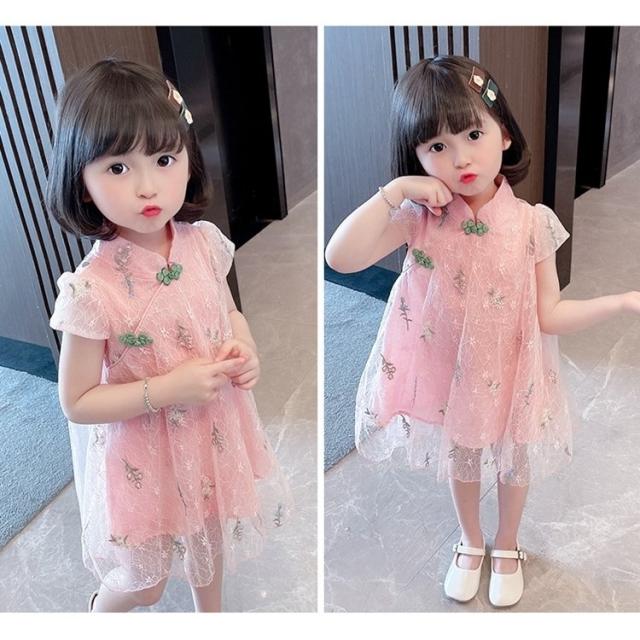 ワンピース 子供服 チャイナドレス風 キッズ ベビー 半袖 膝丈 レース Aライン シースルー 花刺繍 女の子 マオカラー 中華風 可愛い おしゃれ