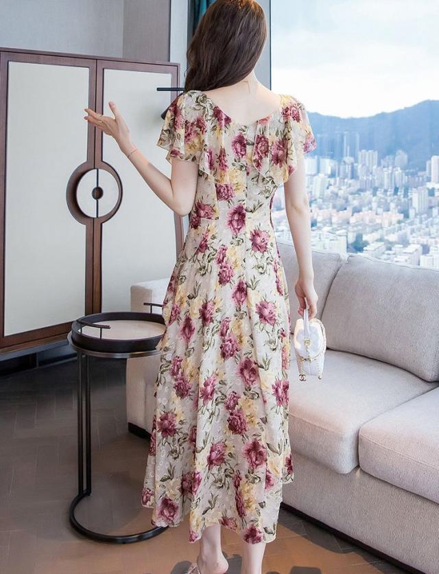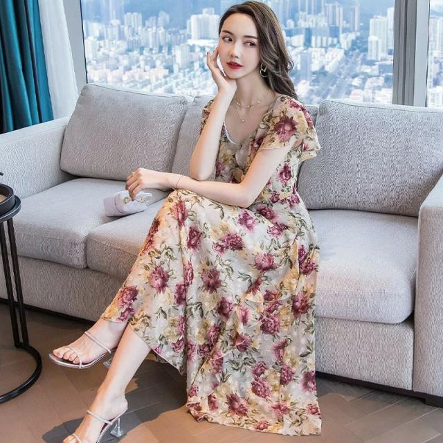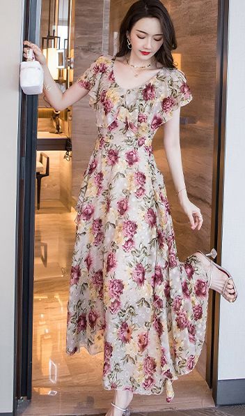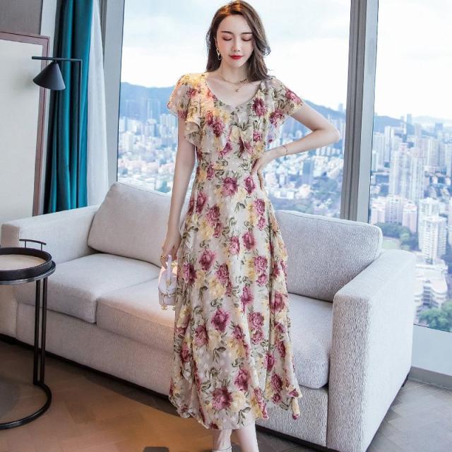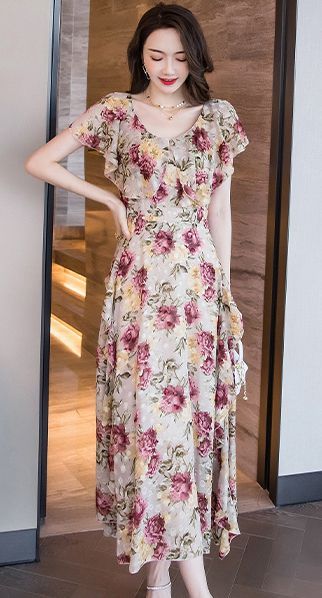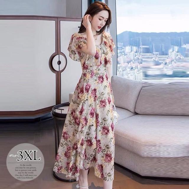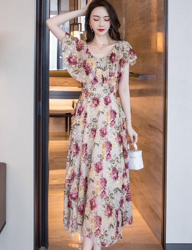 ワンピース 花柄 半袖 シフォン ロング丈 ロマンティック 上品 フェミニン 大人可愛い ママ 母親 クール 可愛い 女子会 /