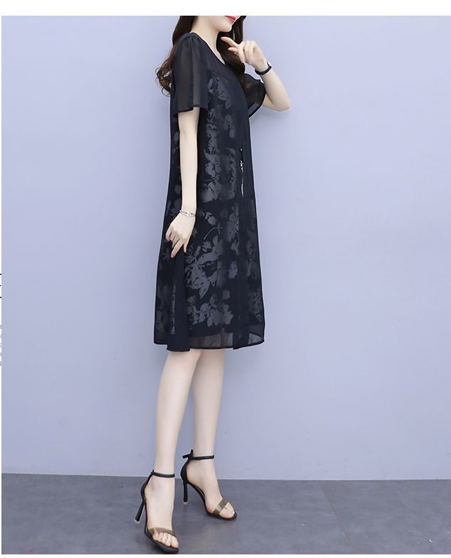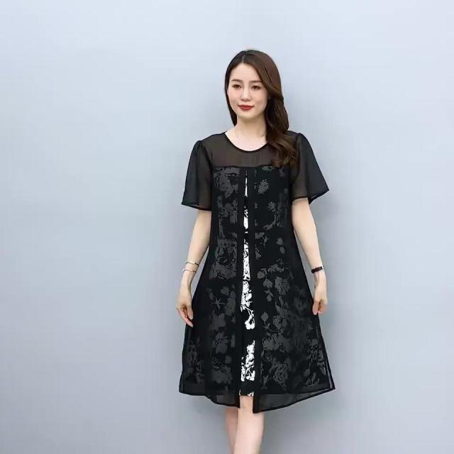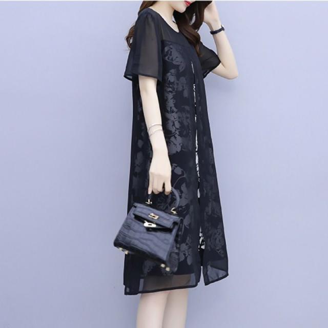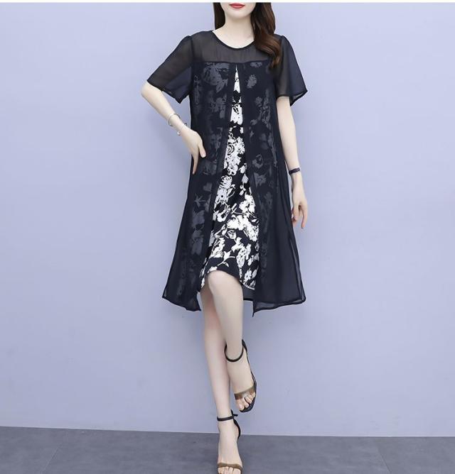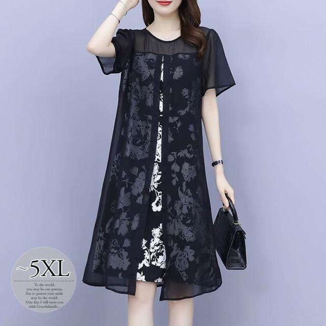 ワンピース プリント柄 ラウンドネック 透け感 重ね着デザイン 大きいサイズ 学校行事 リゾート カジュアルウェア 大人カジュアル 清楚