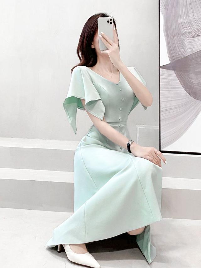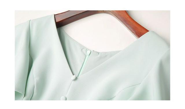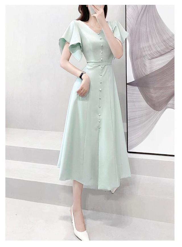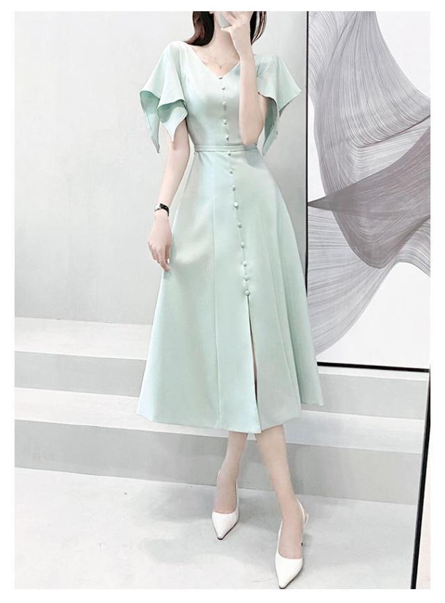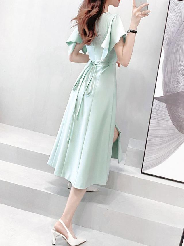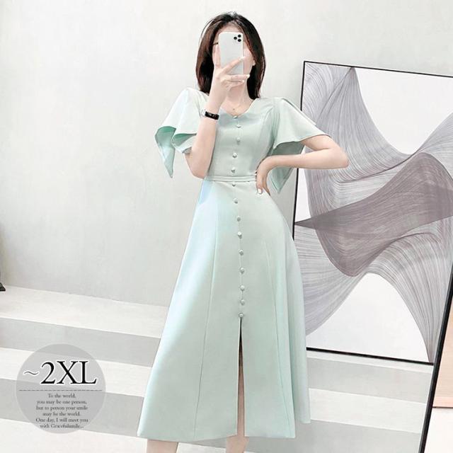 ワンピース 半袖 Vネック ウエストシェイプ ウエストマーク ハイウエスト スリット パステルカラー デザインボタン 袖デザイン 高級