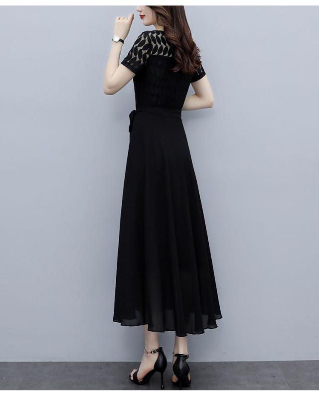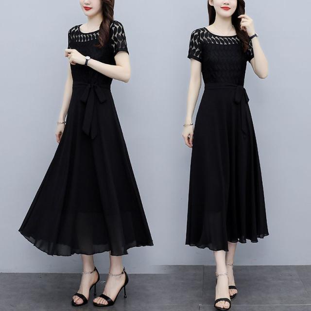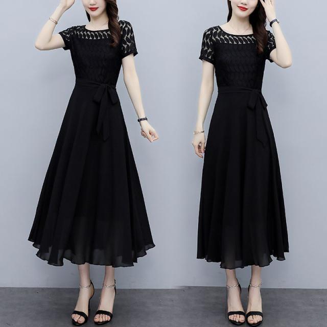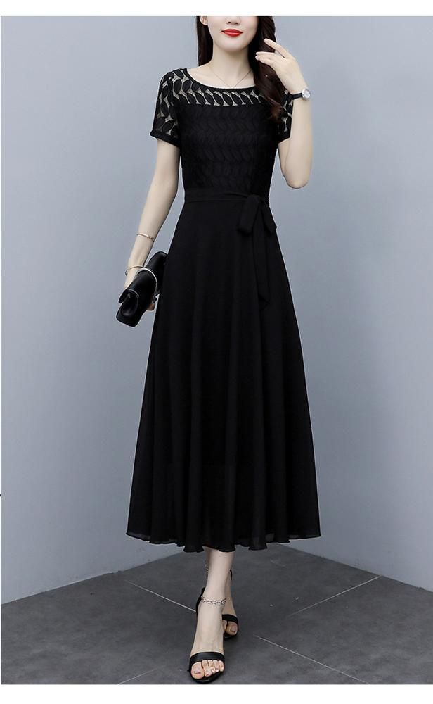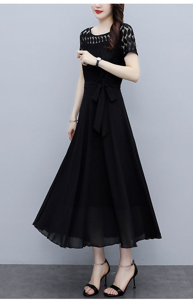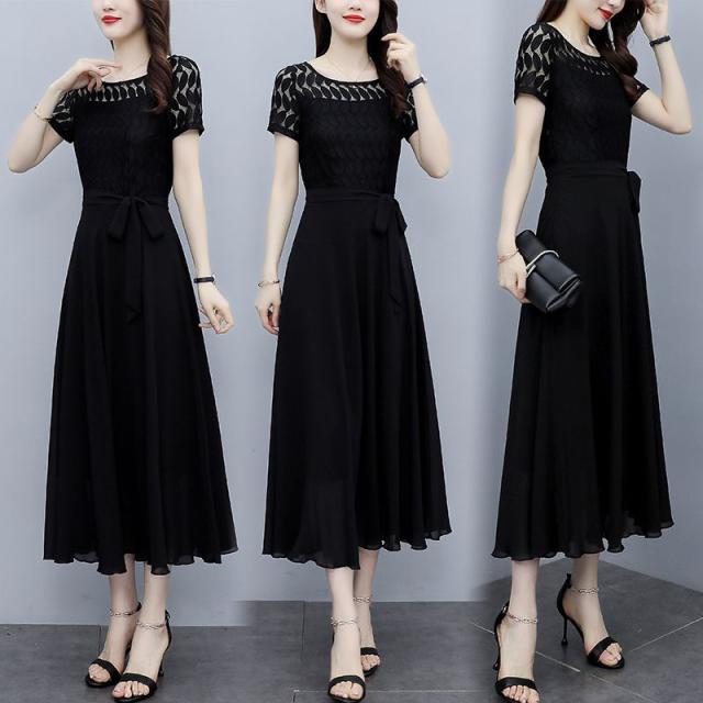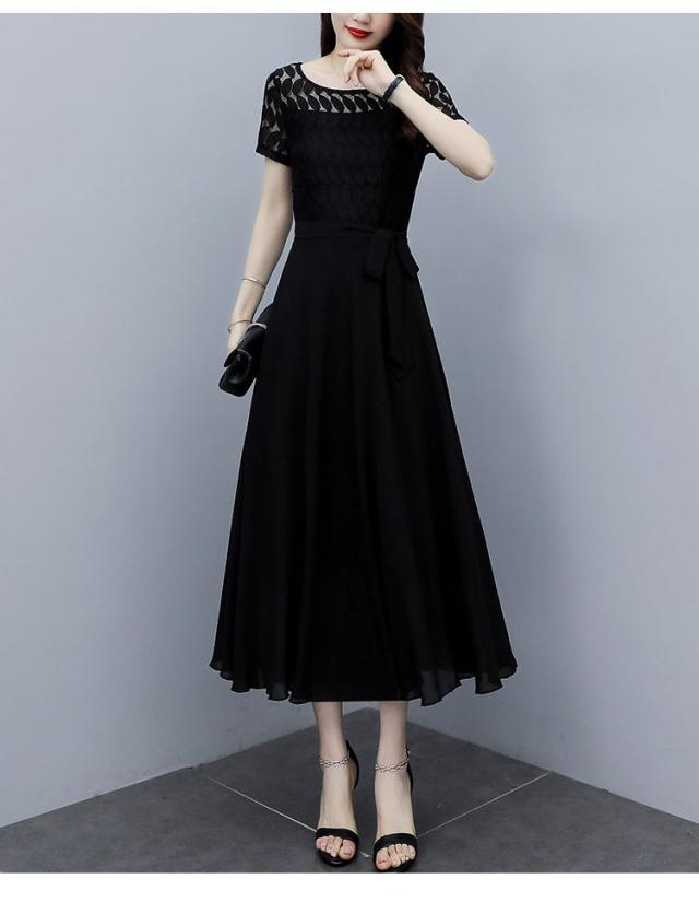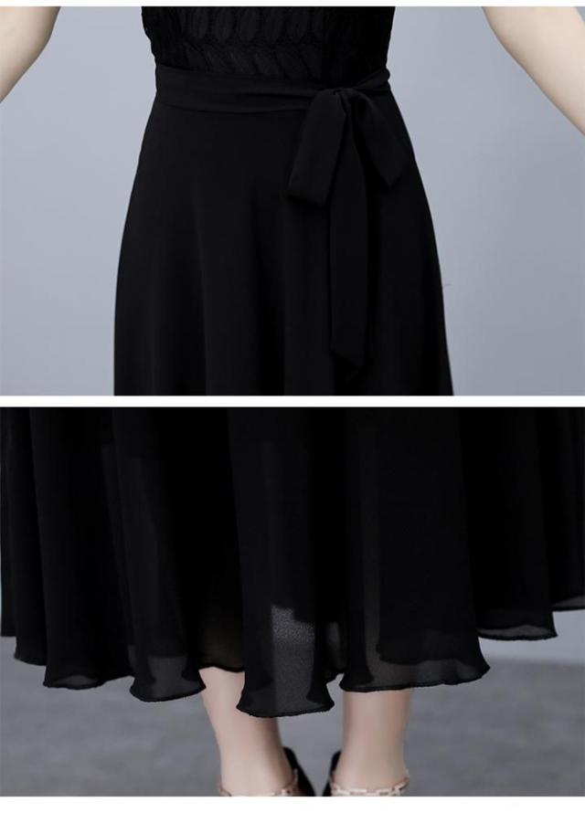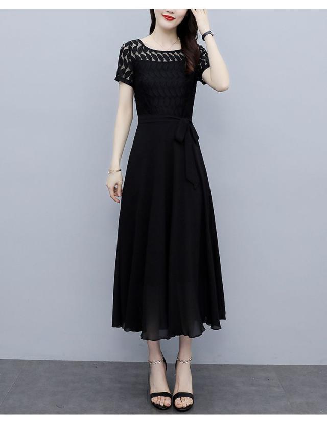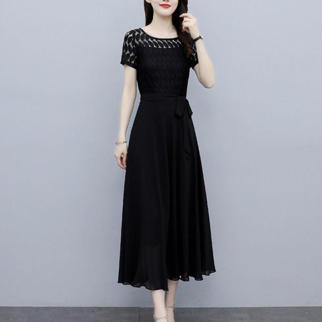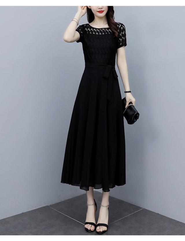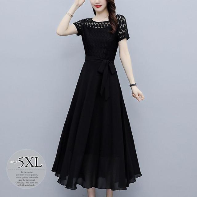 ワンピース 半袖 ウエストリボン 大きいサイズ ブラック ガーリー ドライブ カジュアル 休日 フェミニン 母親 女子会 ママ ディナー