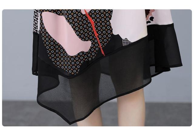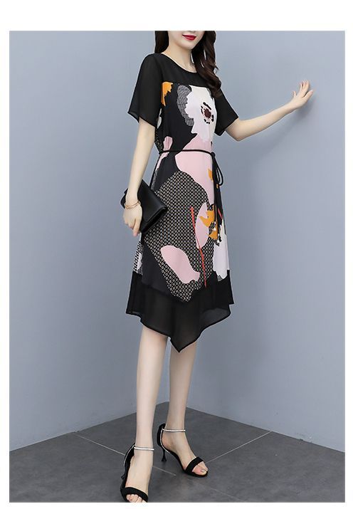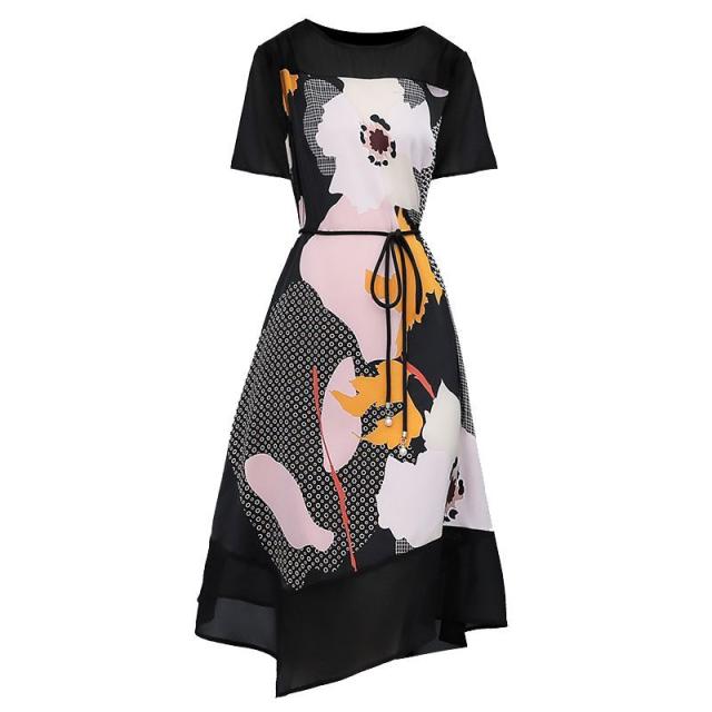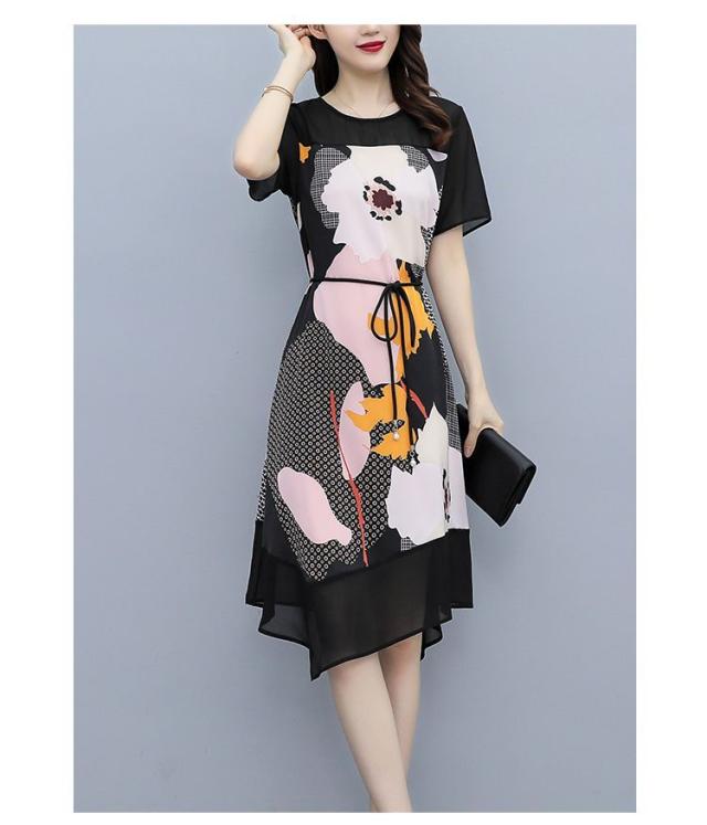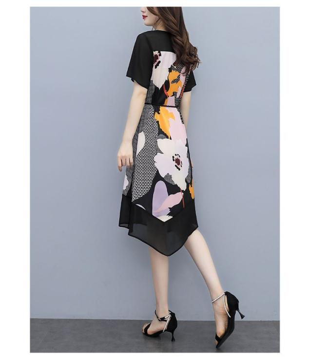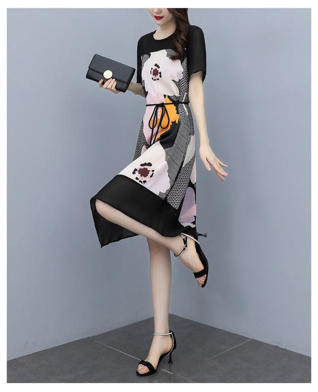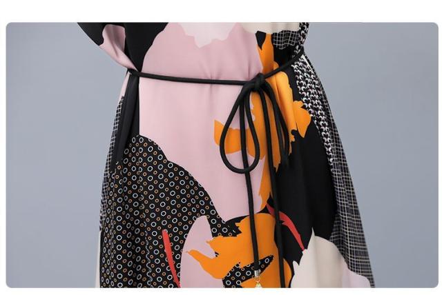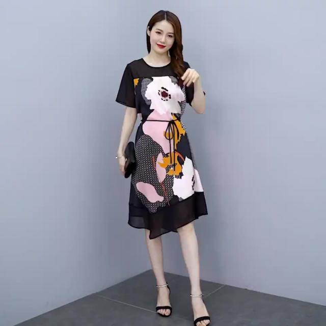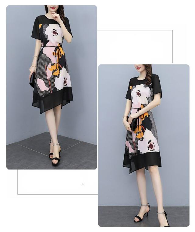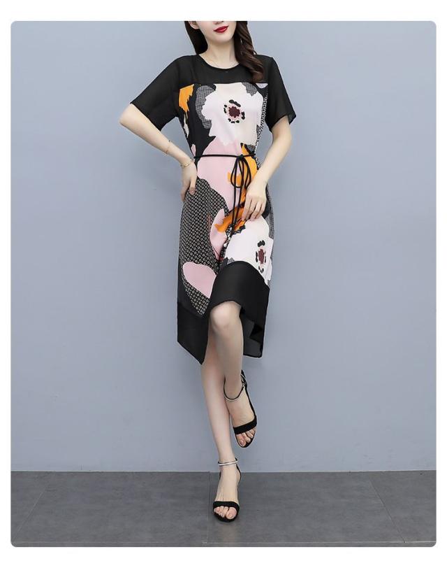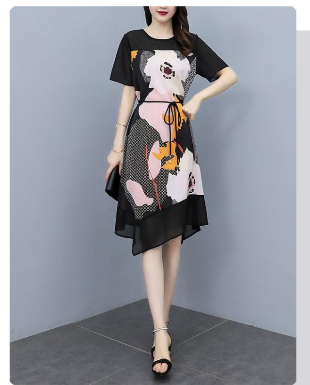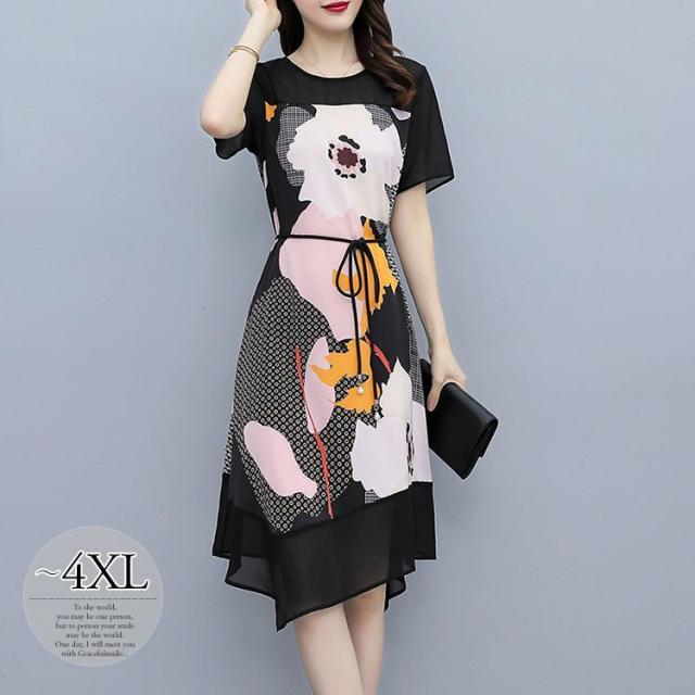 ワンピース プリント柄 ラウンドネック 花柄 半袖 ウエスト紐 大きいサイズ 女子会 キレイ目 お出かけファッション 食事会 カジュアルウェア