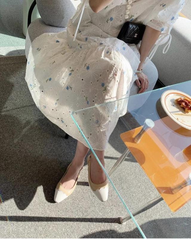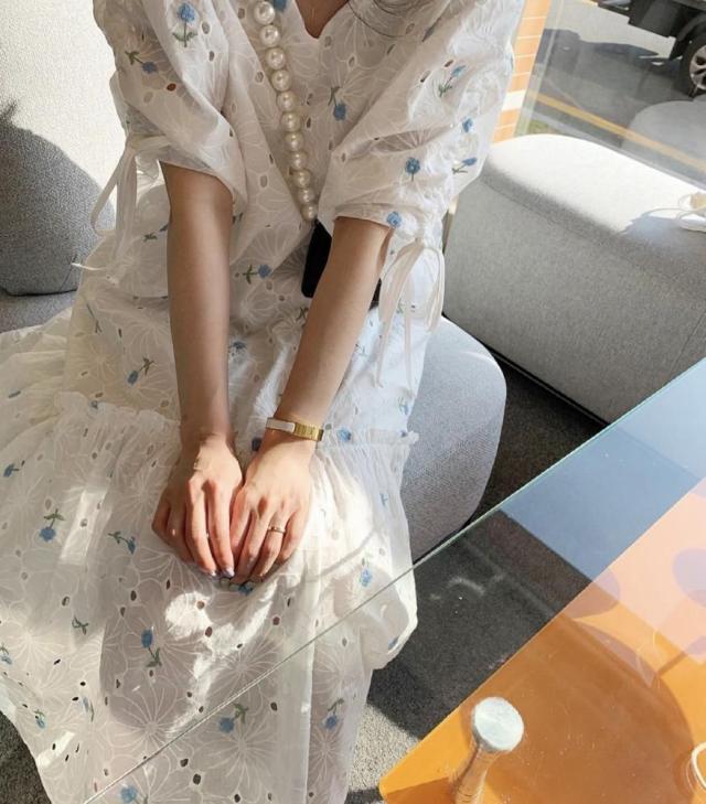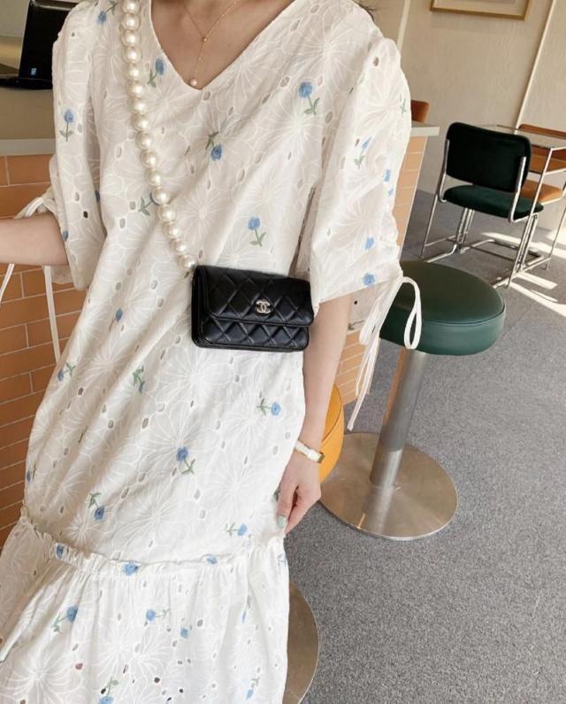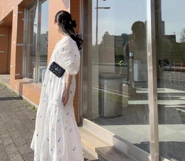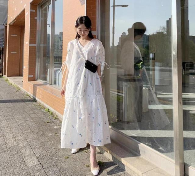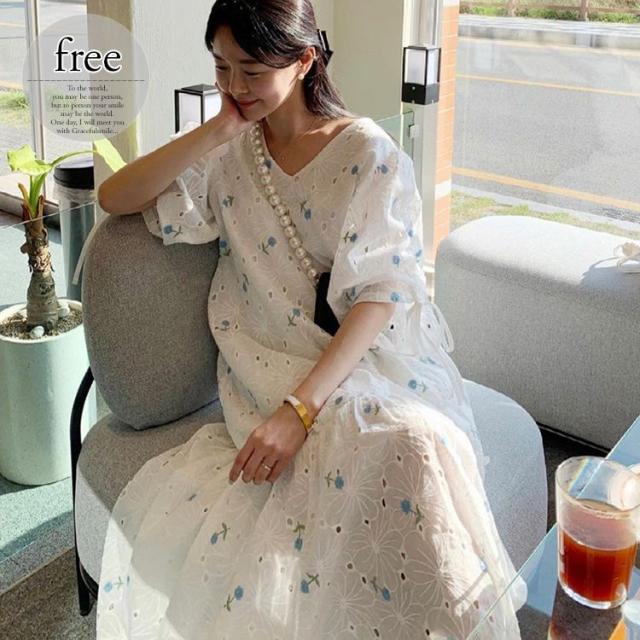 ワンピース サマー パフスリーブ 花柄 半袖 Vネック 総柄 透け感 小花柄 Aライン ギャザー ゆったり ロングワンピース 袖デザイン
