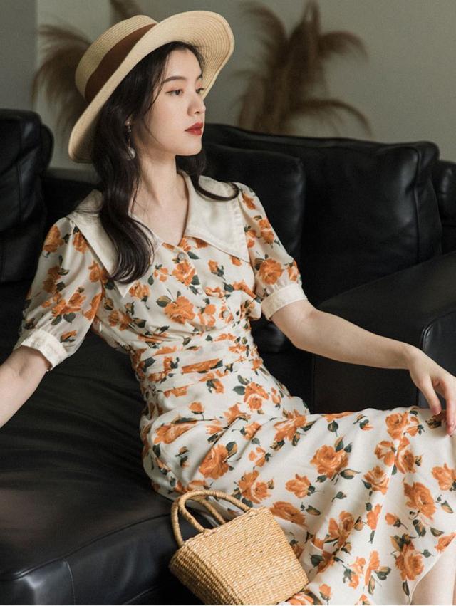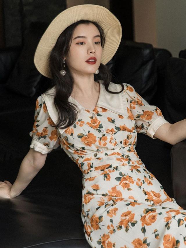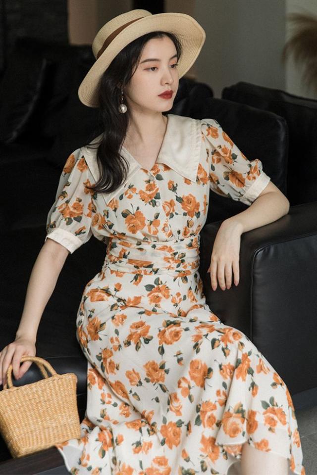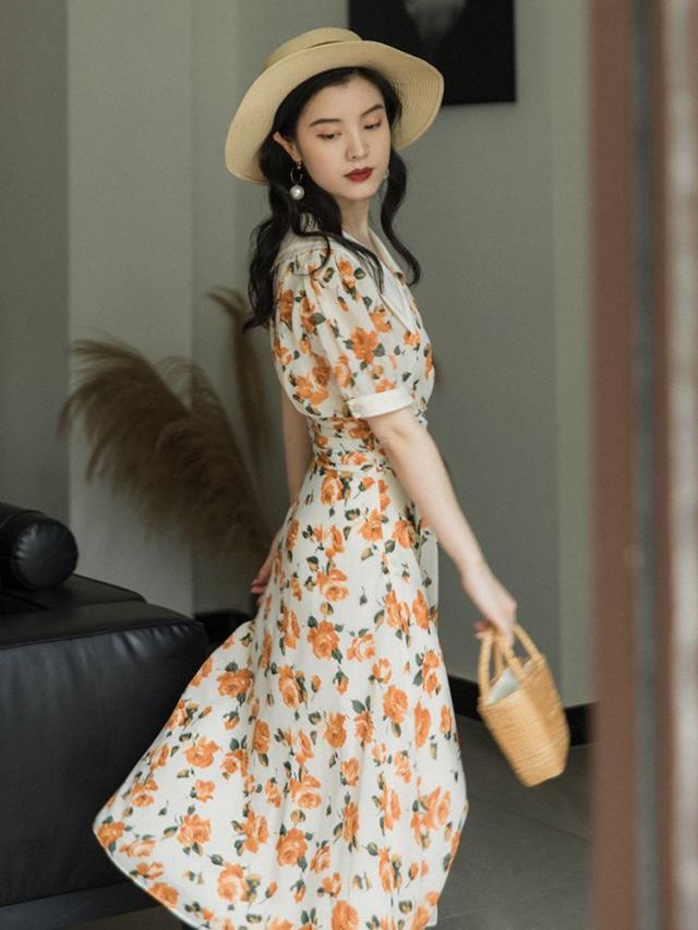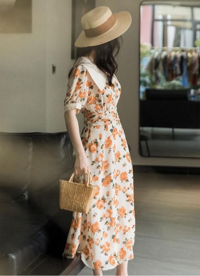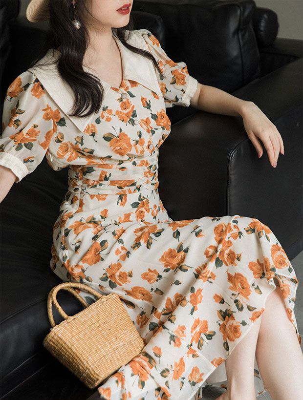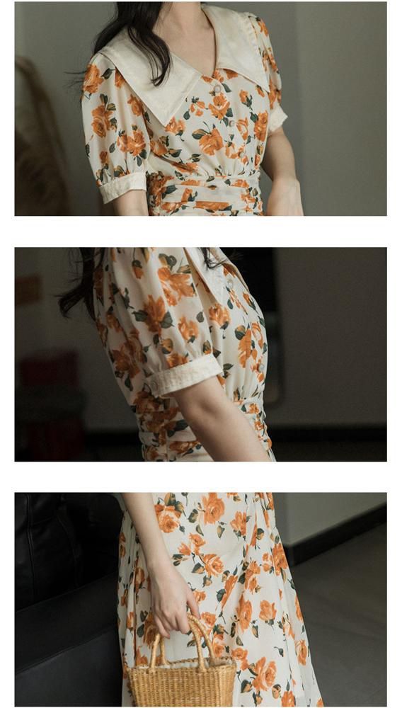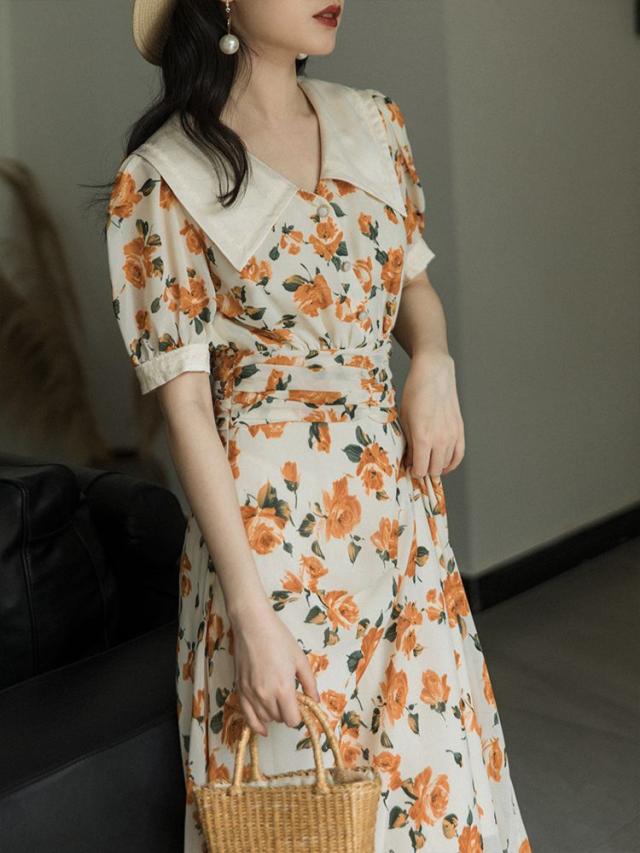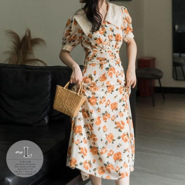 ワンピース サマー 襟付き パフスリーブ 花柄 半袖 総柄 とろみ Aライン ウエストシェイプ 大きめ襟 フロントボタン ロングワンピース