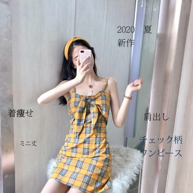 2020新作 ミニ丈ワンピース チェック柄ワンピース 夏 肩出しデザイン 着痩せ 可愛い ショットワンピース 春 きれいめ 上品