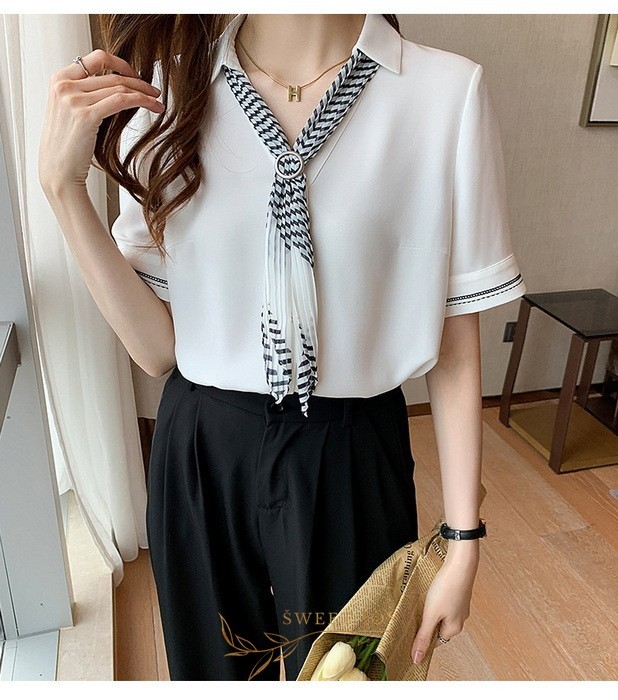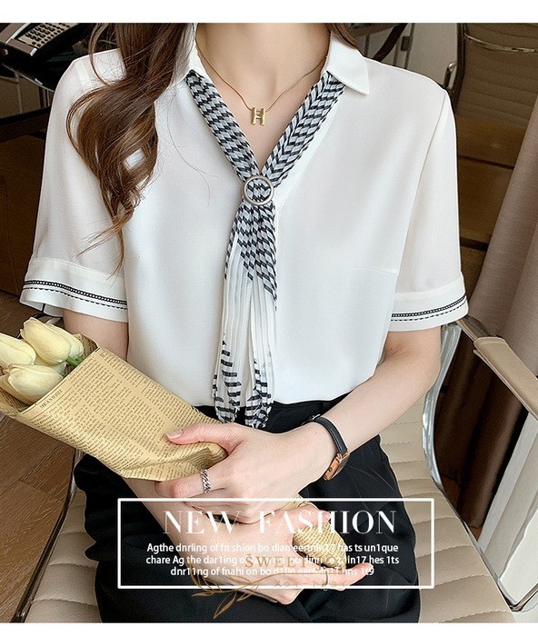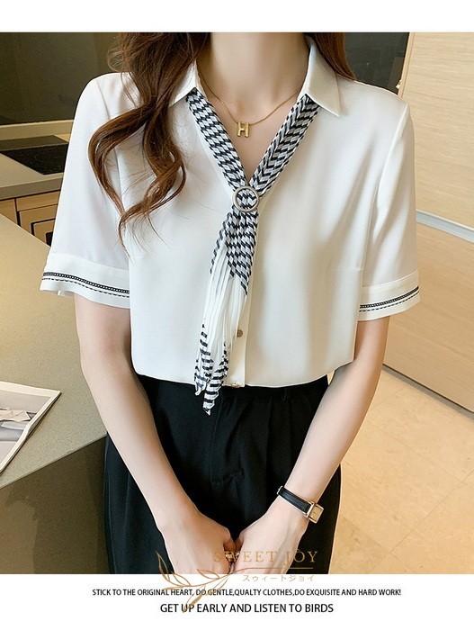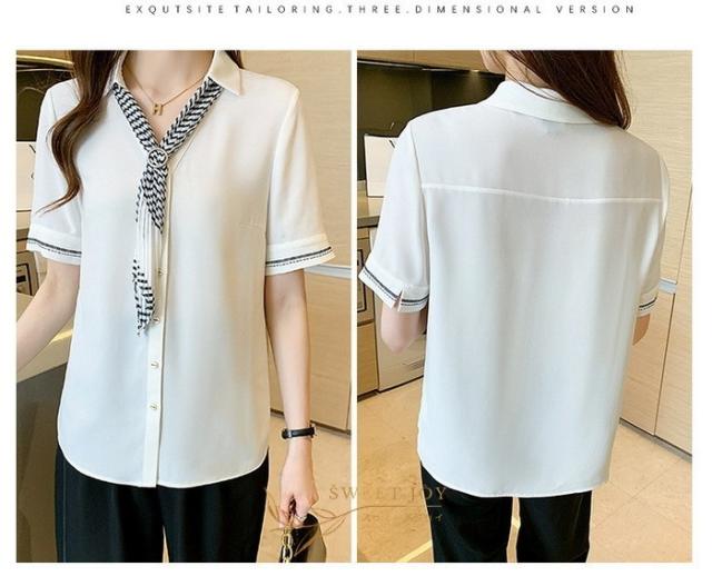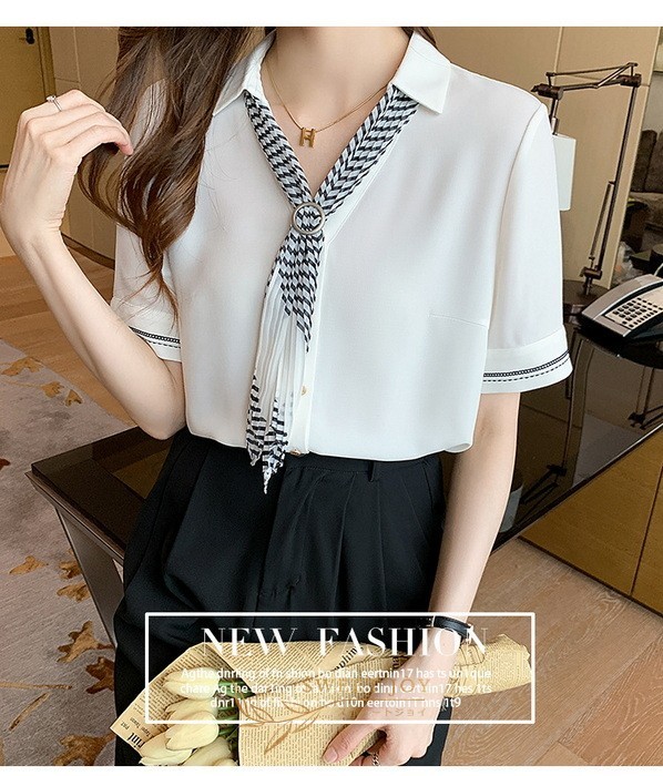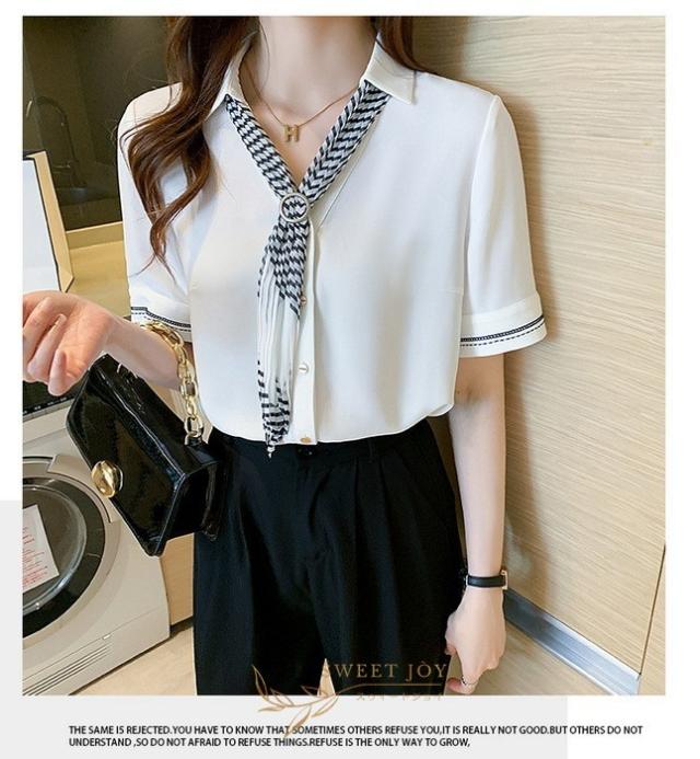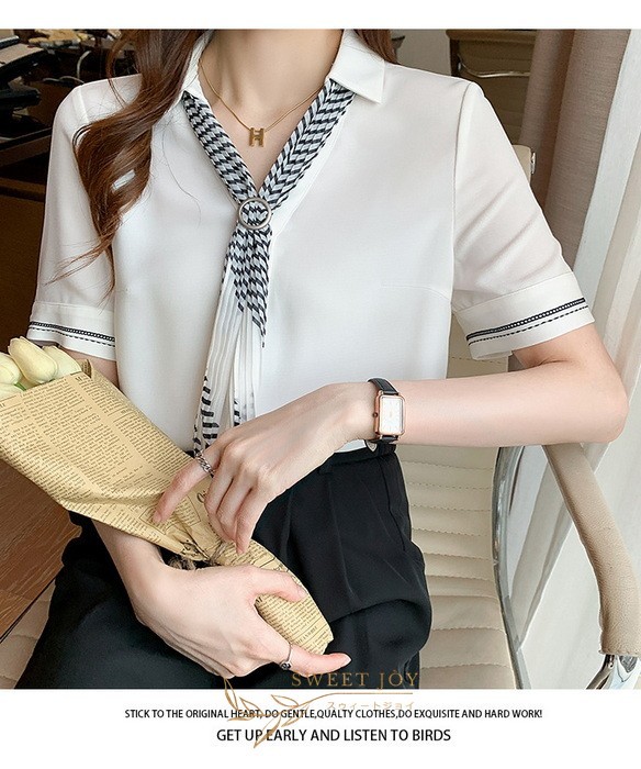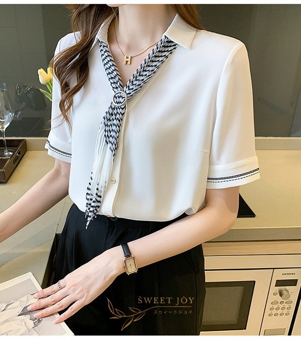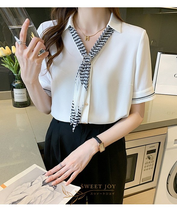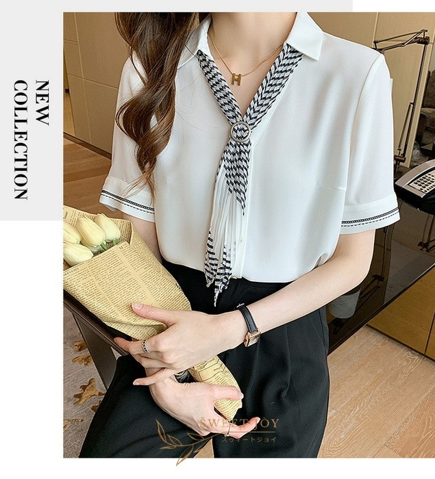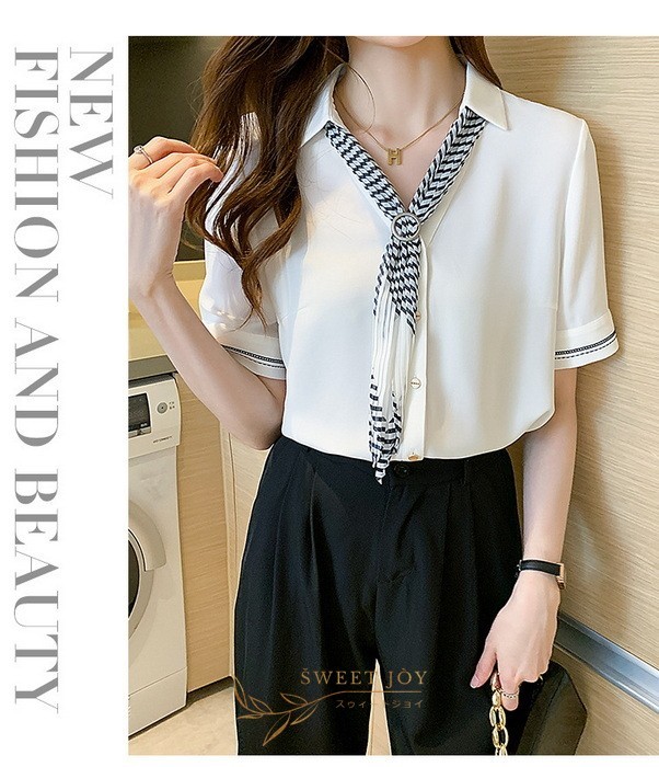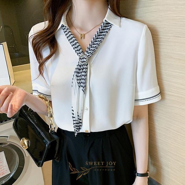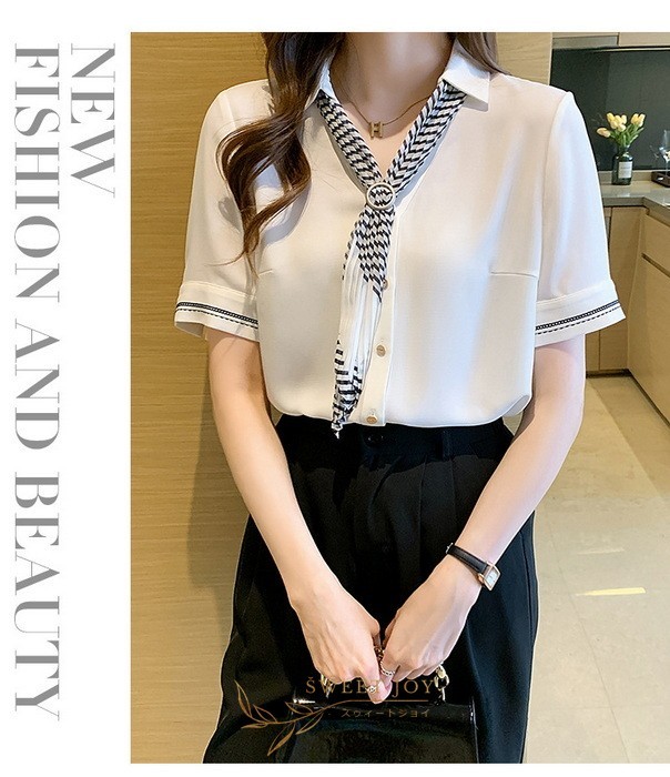 ブラウス レディース 40代 春夏新作 オシャレブラウス シフォンブラウス白 Vネックブラウスリボンネック 半袖トップス 韓国風 大人通勤 ゆったりシャツ 30代