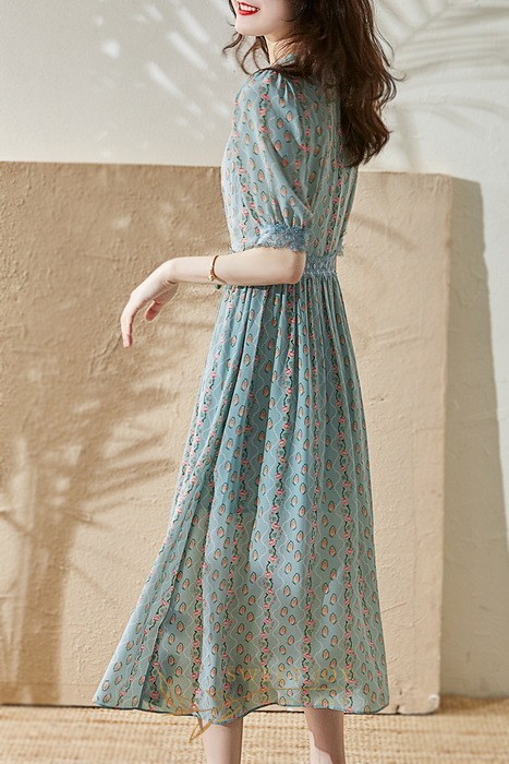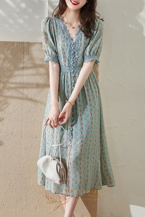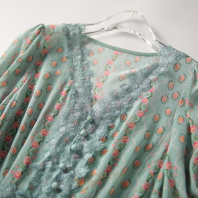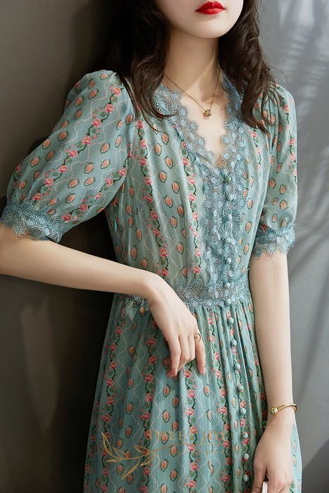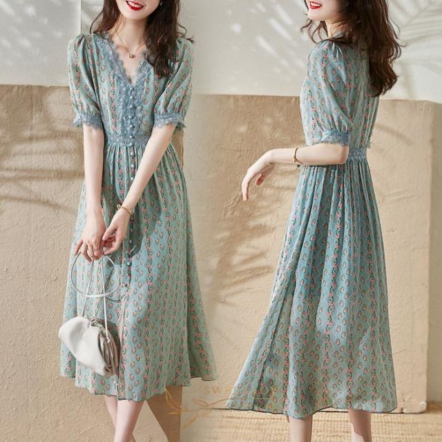 ワンピース レディース 40代マキシ丈ワンピース 春夏 半袖ワンピースレースVネック きれいめ花柄シフォンスカート 上品韓国風 オシャレ通勤 大人可愛い30代
