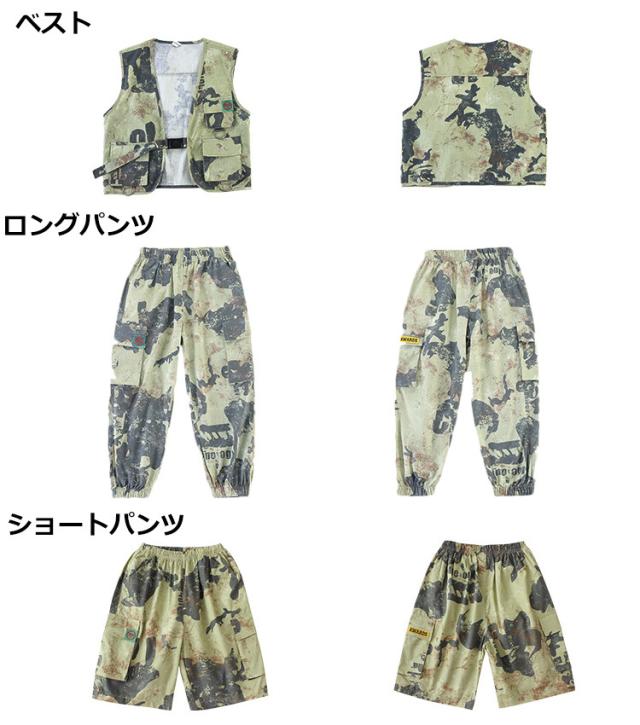 キッズ ダンス衣装 迷彩 パンツ セットアップ ベスト ショート ロング 迷彩柄 トップス カーゴパンツ 長ズボン ヒップホップ 韓国 チアガール 体育祭 応援団