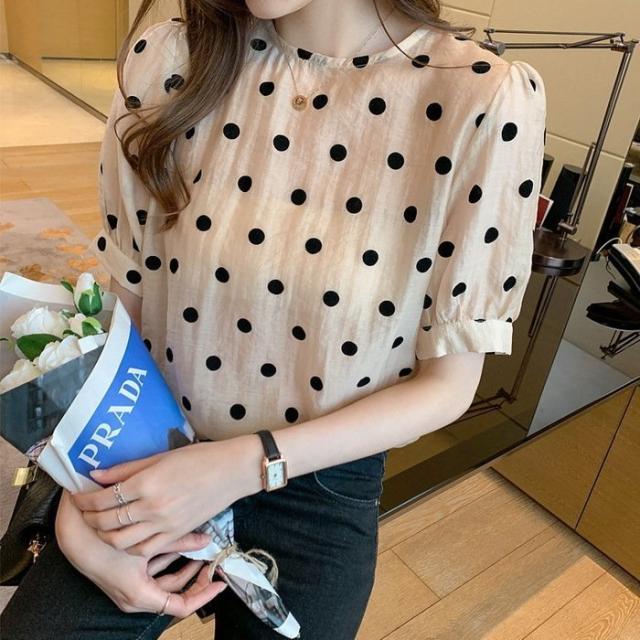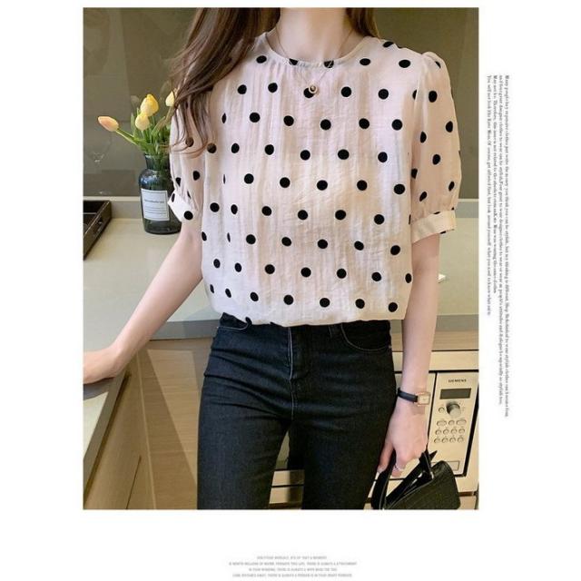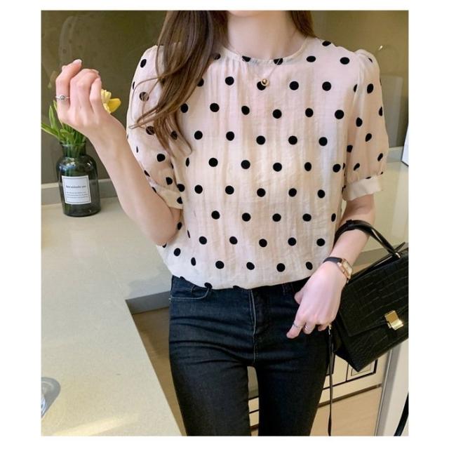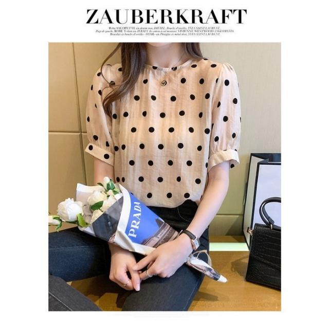 ブラウス レディース 40代 春夏 オシャレブラウス シフォン 可愛いドット柄ブラウス パフスリーブ 半袖トップス おしゃれ 大人 通勤 ゆったりTシャツ 30代50代