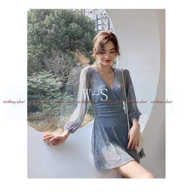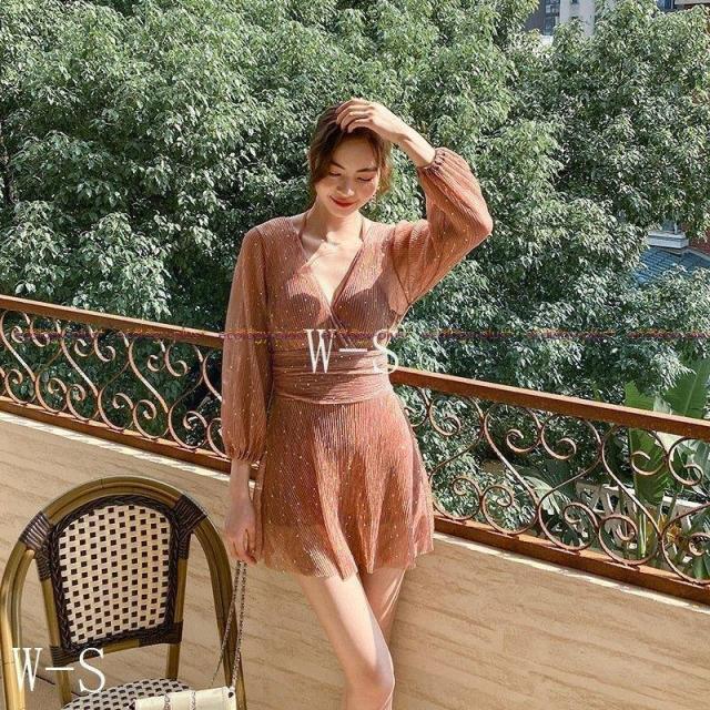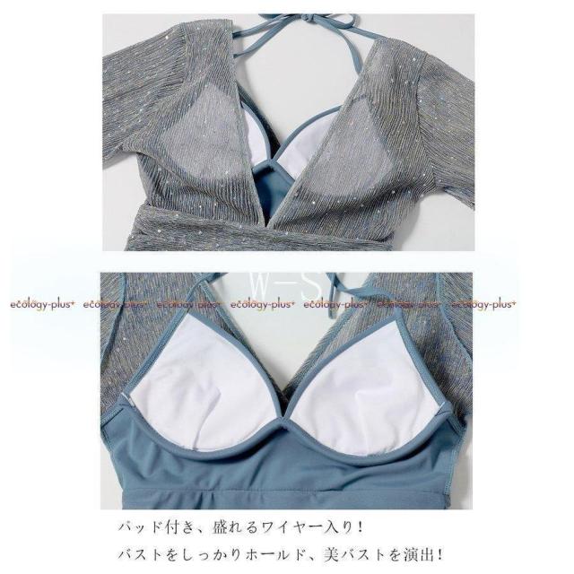 レディースオールインワン水着ワンピース水着長袖体型カバーシフォンVネック露出控えめ温泉用お湯用2colorM-XXL