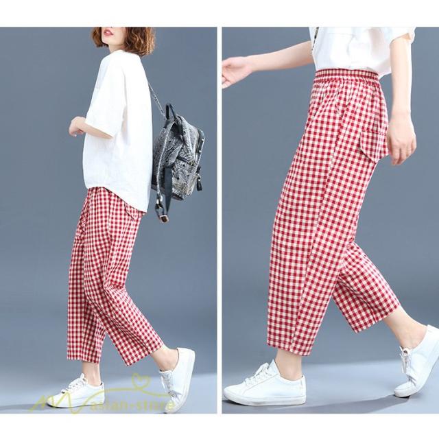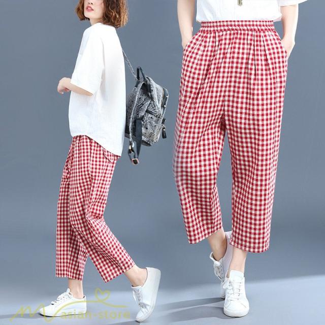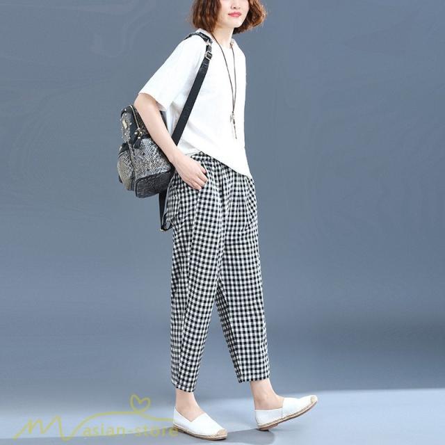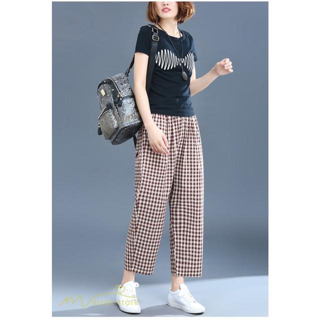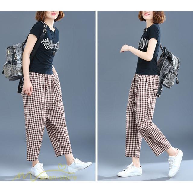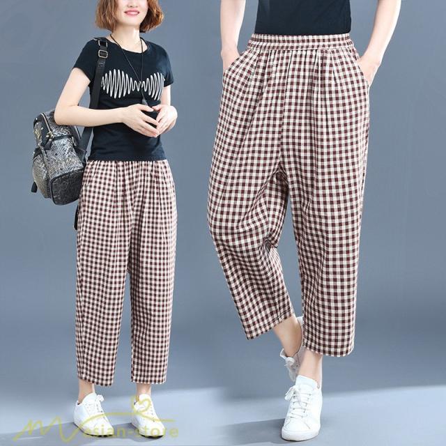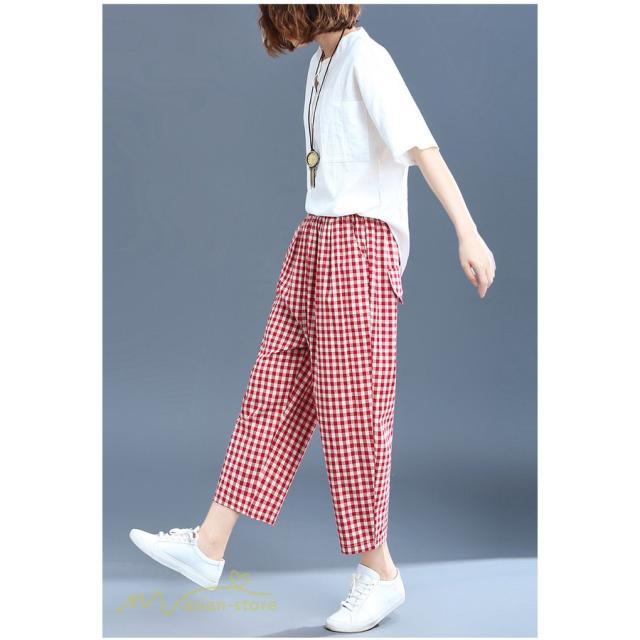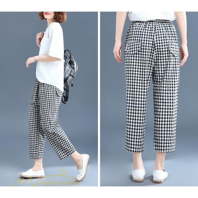 パンツ テーパード ワイドパンツ ゆったり 夏服 ボトムス チェック柄 きれいめ レディース テーパードパンツ 女性着 大きいサイズ 麻綿 ウエストゴム 日常感 夏