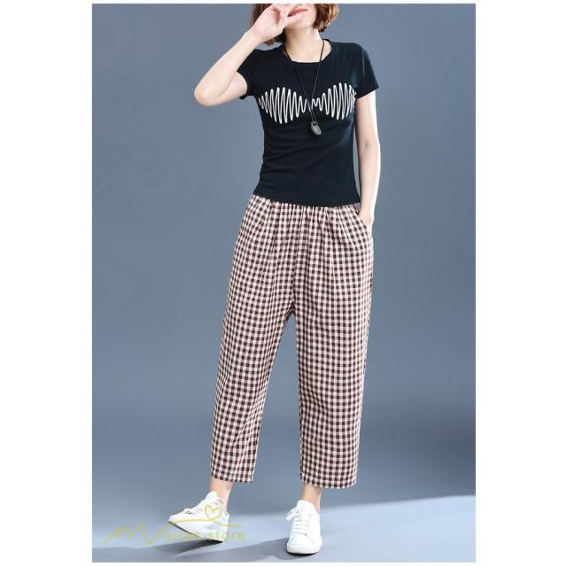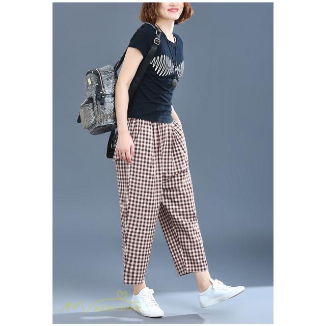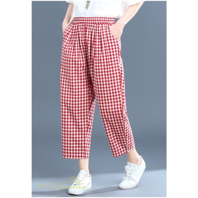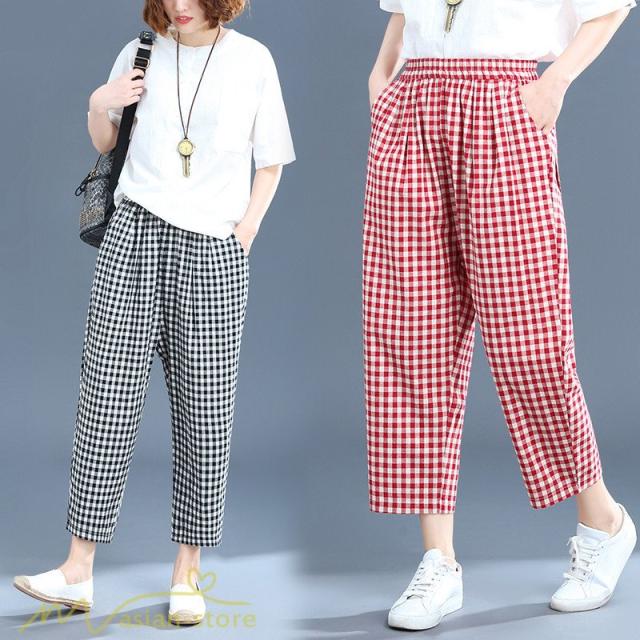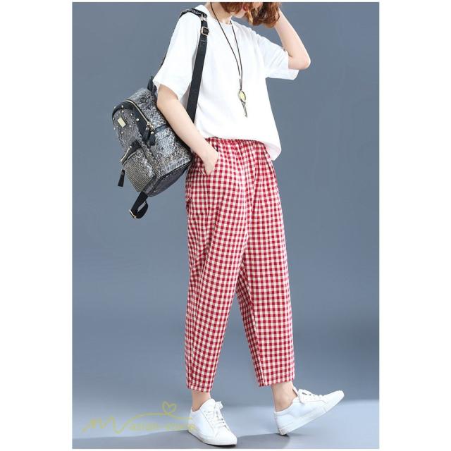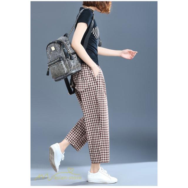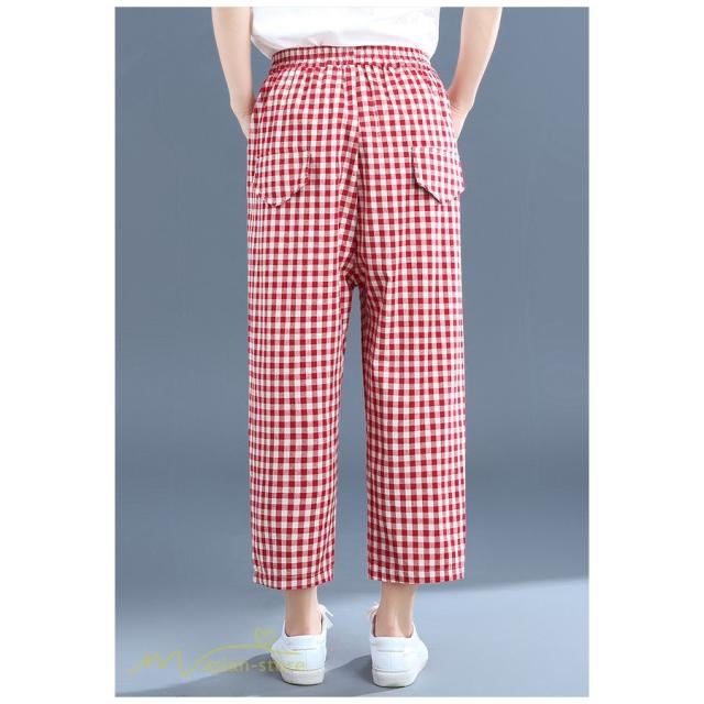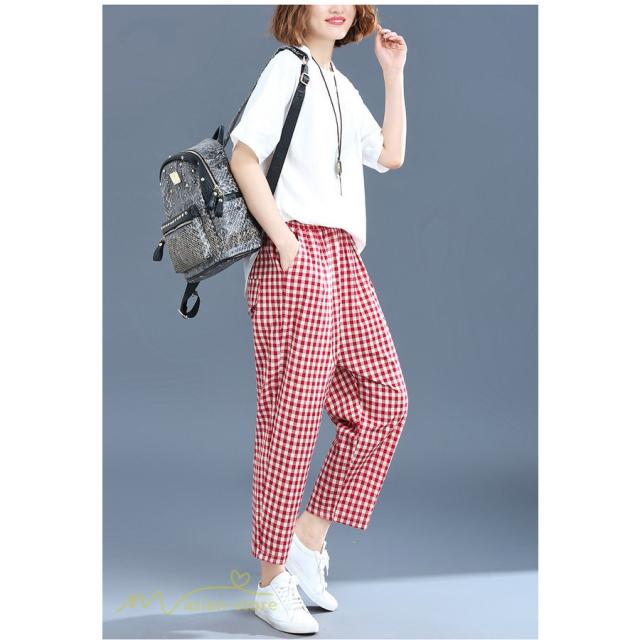 パンツ テーパード ワイドパンツ ゆったり 夏服 ボトムス チェック柄 きれいめ レディース テーパードパンツ 女性着 大きいサイズ 麻綿 ウエストゴム 日常感 夏