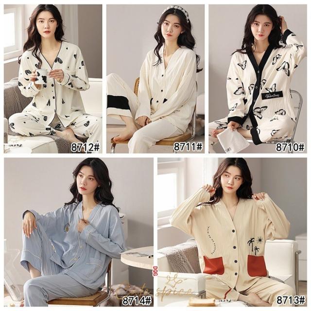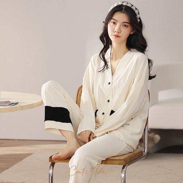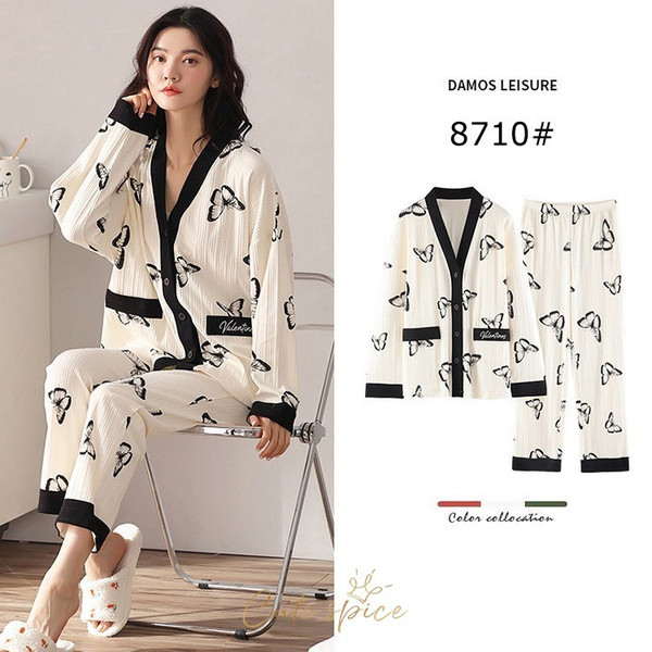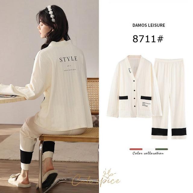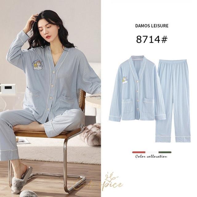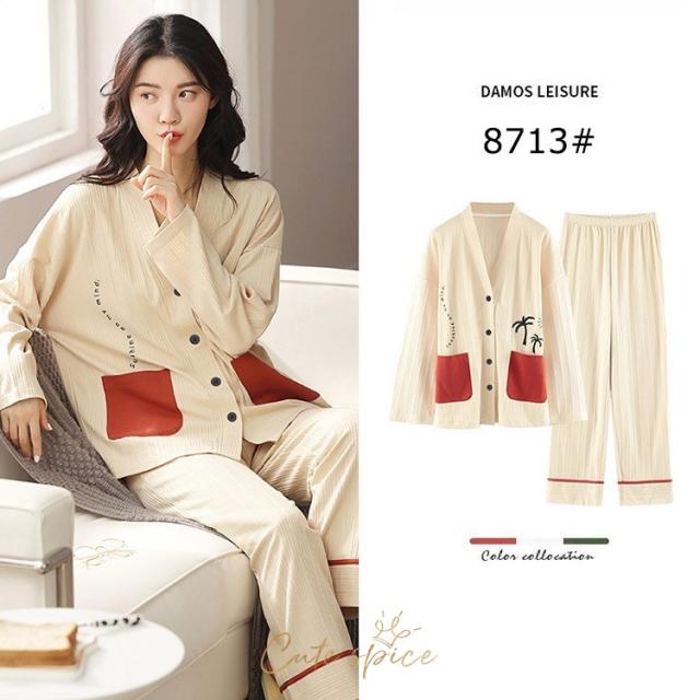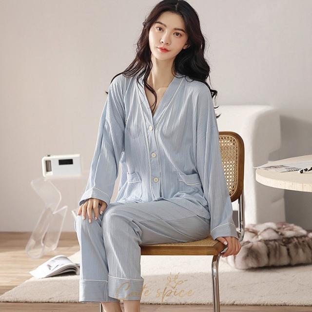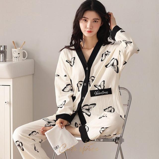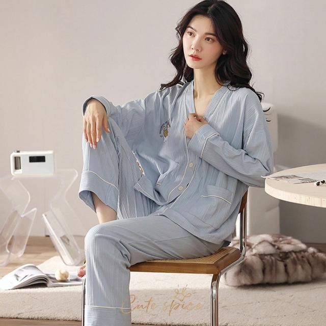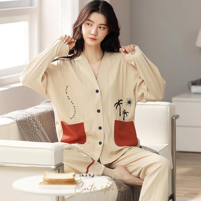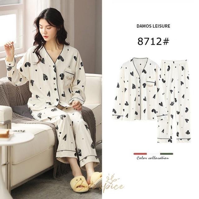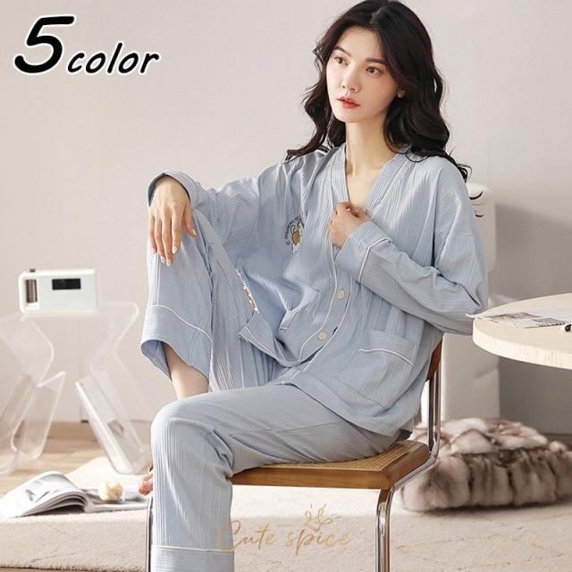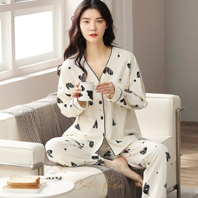 パジャマ ルームウェア レディース 春秋 長袖 パジャマ 前開きルームウェア ハート柄 vネック ロングパンツパンツ上下セット 可愛いパジャマ ゆったり