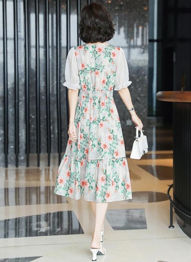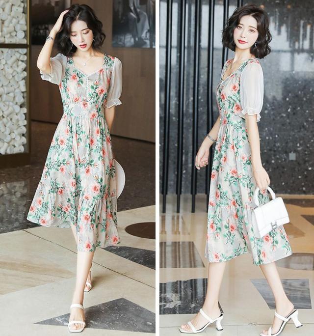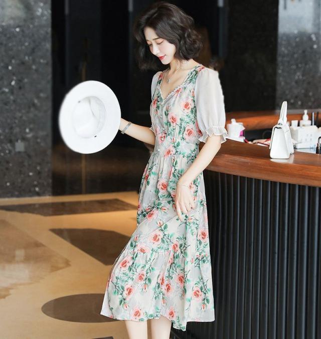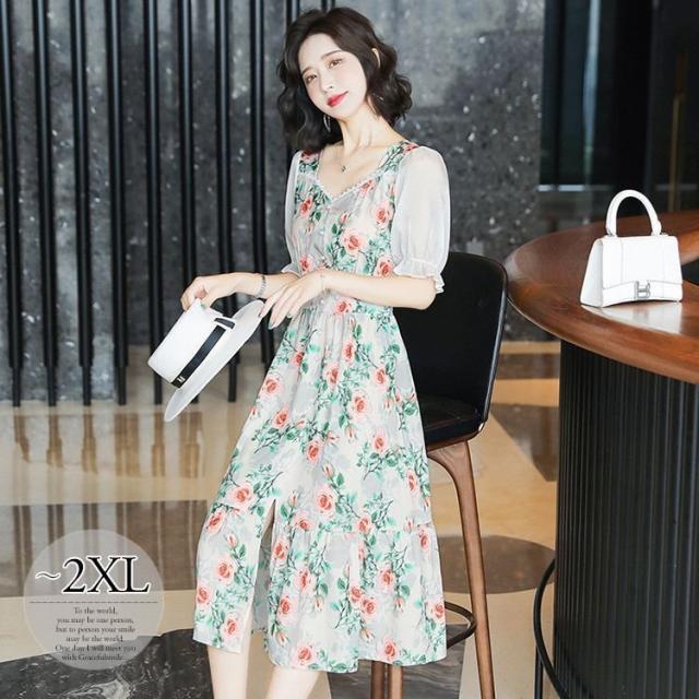 ワンピース 花柄 半袖 袖フリル シフォン 透け感 膝下丈 ボタン ロマンティック 清楚 大人可愛い ガーリー 美人 女子会 リゾート