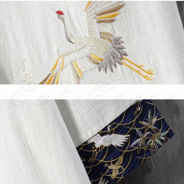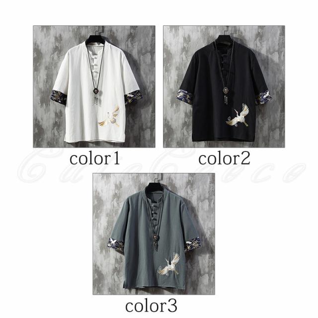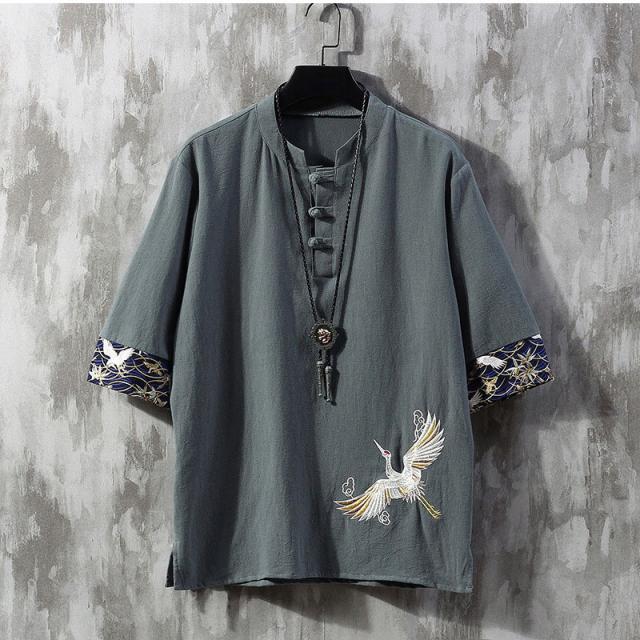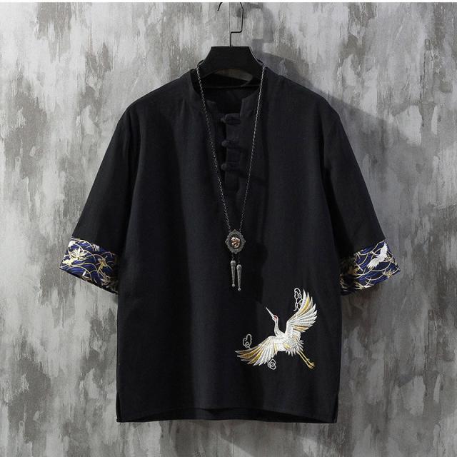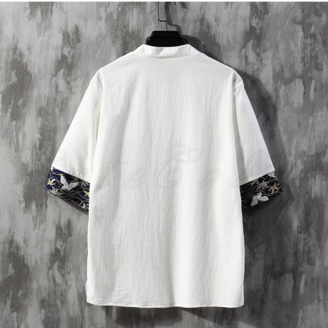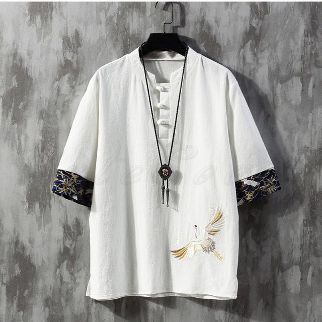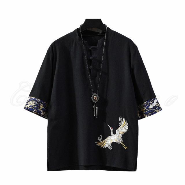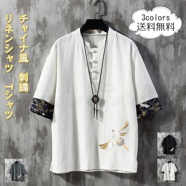 リネンシャツ メンズ Tシャツ 刺繍 鶴柄 チャイナボタン チャイナ風 トップス カジュアル 薄手 ゆったり 男性用 21年夏新作 きれいめ おしゃれ
