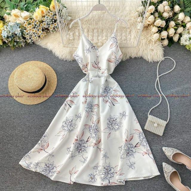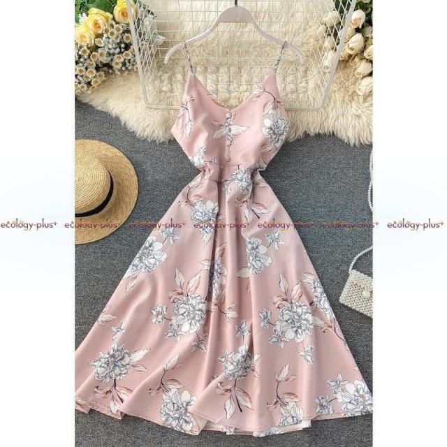 バケーションドレスの女性のインの小さなセクシーなサスペンダーVネックのウエストは細くて甘いプリントのミドル丈スカート