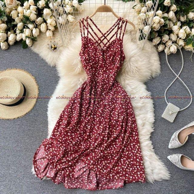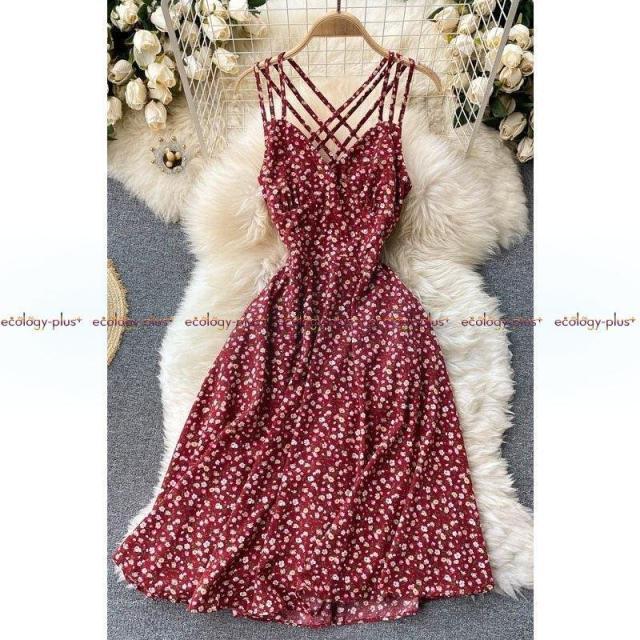 フレンチレトロシーサイドバケーショントラベルドレスセクシーストラップレス初恋フローラルスリムスリミングサスペンダーミドル丈ドレス