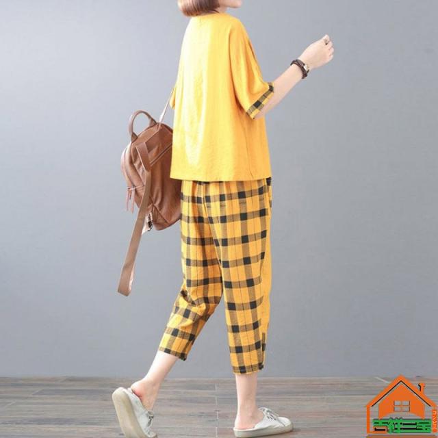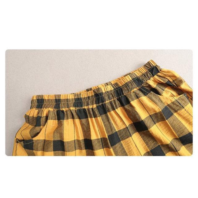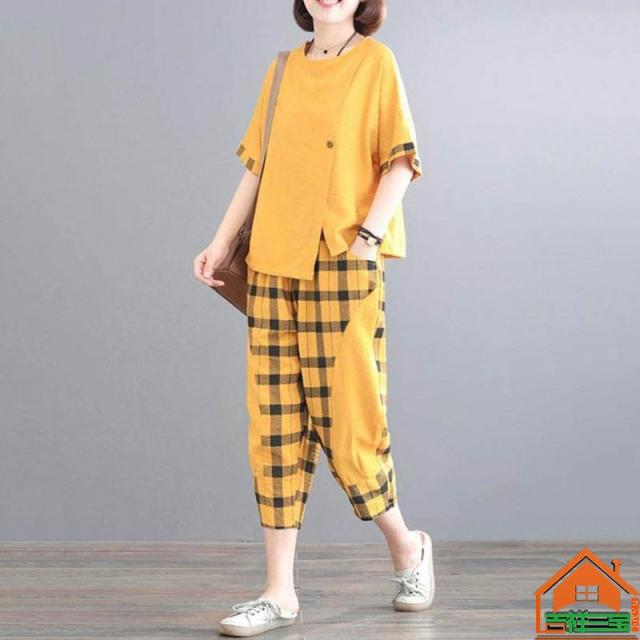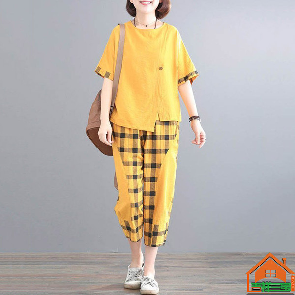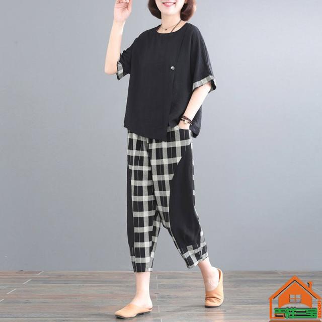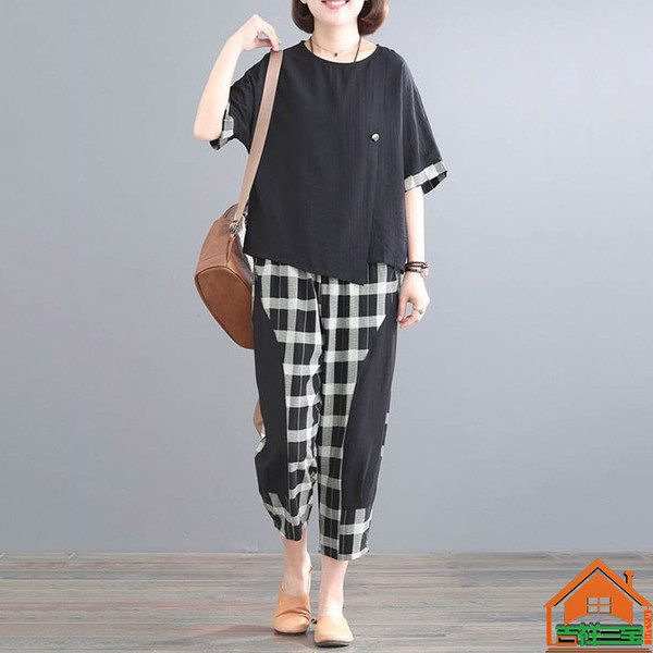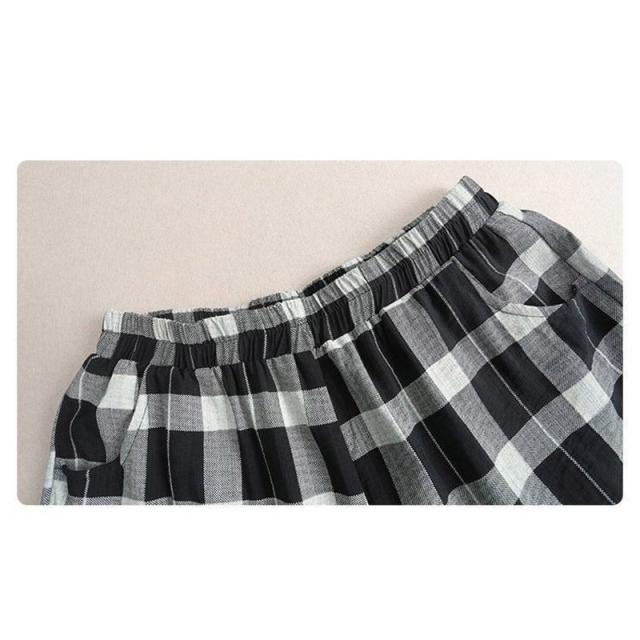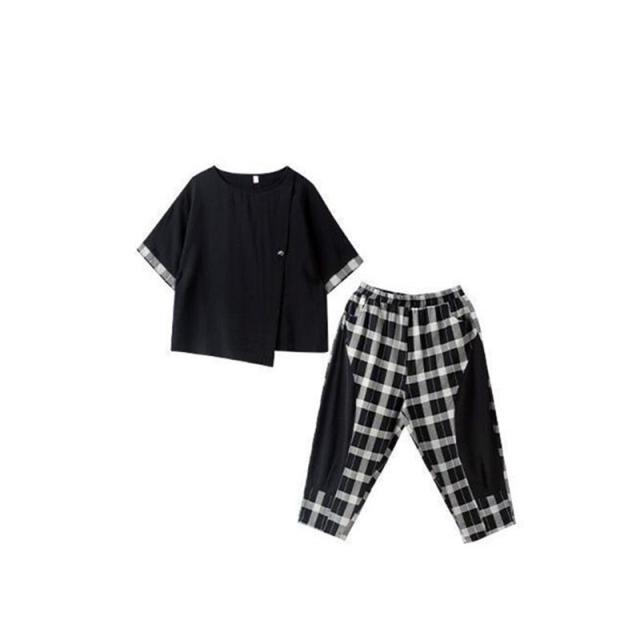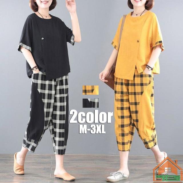ゆったり不規則トップス チェック柄サルエル ガウチョ パンツ 2点 セットアップ ワイド 体型カバー シャツ レディース M〜3XL