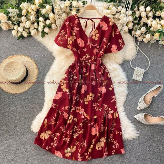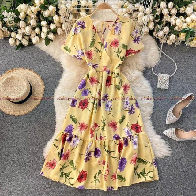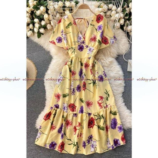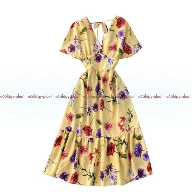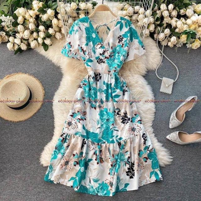 2021年春の新女神ファン気質Vネックウエストスリミングミドル丈ホリデースタイルフローラルドレスレディース
