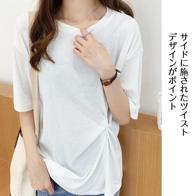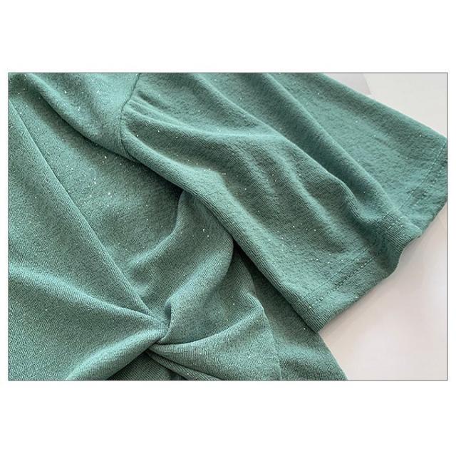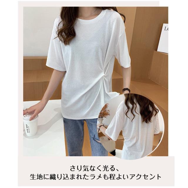 | サイズについての説明 | サイドに施されたツイストデザインがポイント。さり気なく光る、生地に織り込まれたラメも程よいアクセント◎シンプルながらも洒落感のあるデザインが魅力のトップスです。肩に沿って落ちるショルダーラインと、ボディラインを拾わないゆったりとしたシルエットが今年らしい一枚◎横広に開いたネックラインは、首元をスッキリと見せます。サラリと気持ちいい、シャリ感のある生地で着心地も抜群!大人のカジュアルスタイルにおすすめです。■伸縮性:良い。■透け感:ややあり。■裏地:無し。 |
