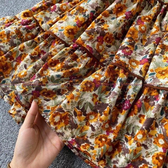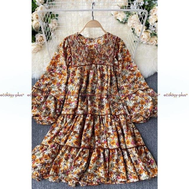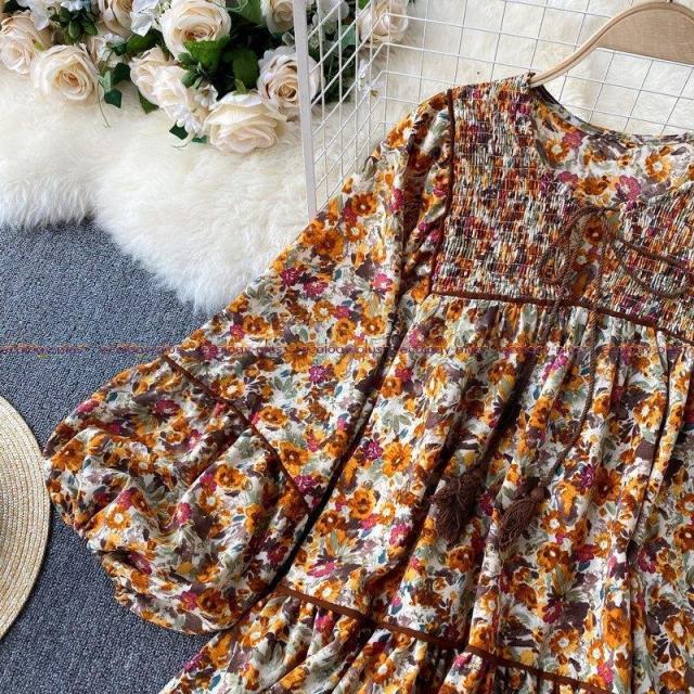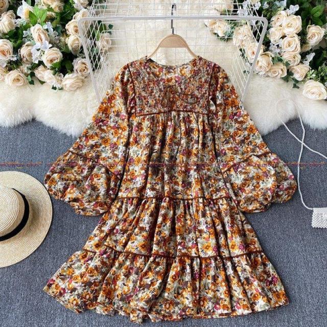 2021年春の新しいフレンチドレス女性レトロランタンスリーブルーズショートドールスカートフローラルトルコギキョウスカート