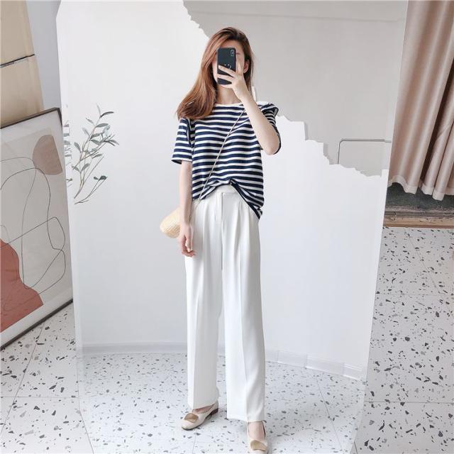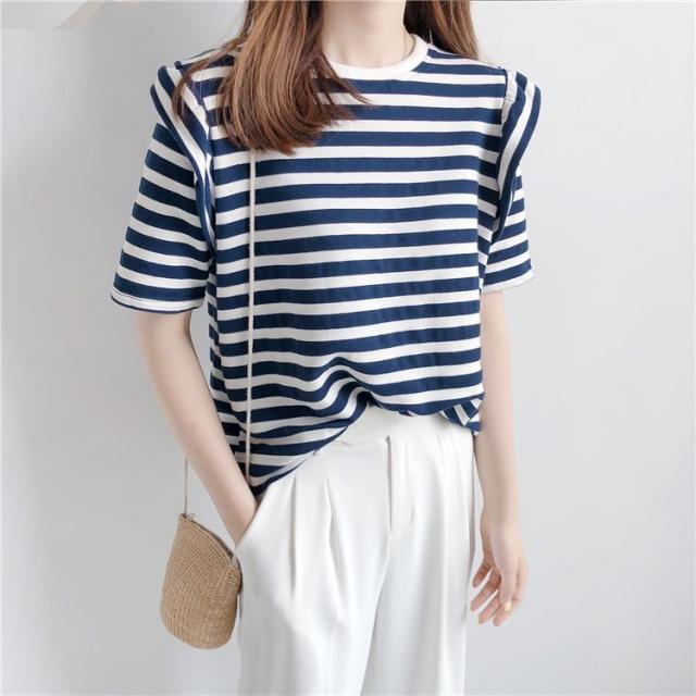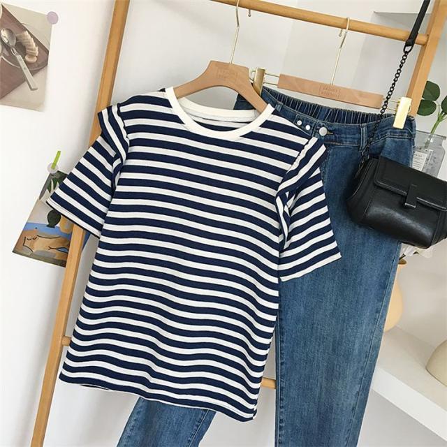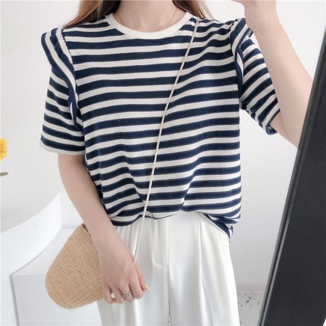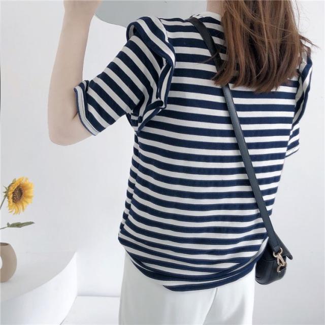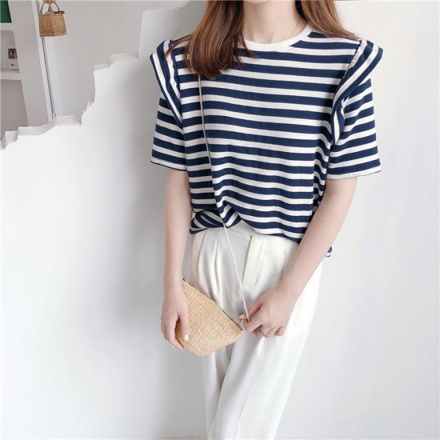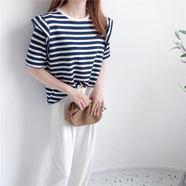シャツ トップス サマー ラウンドネック ボーダー柄 半袖 総柄 フリル ベーシック 袖デザイン ナチュラルコーデ 涼しげ ディナー 上品