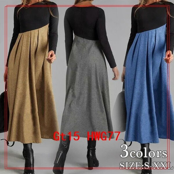 バイカラーワンピースロング丈長袖フレアタイトカジュアルきれいめ秋冬ワンピースレディース()