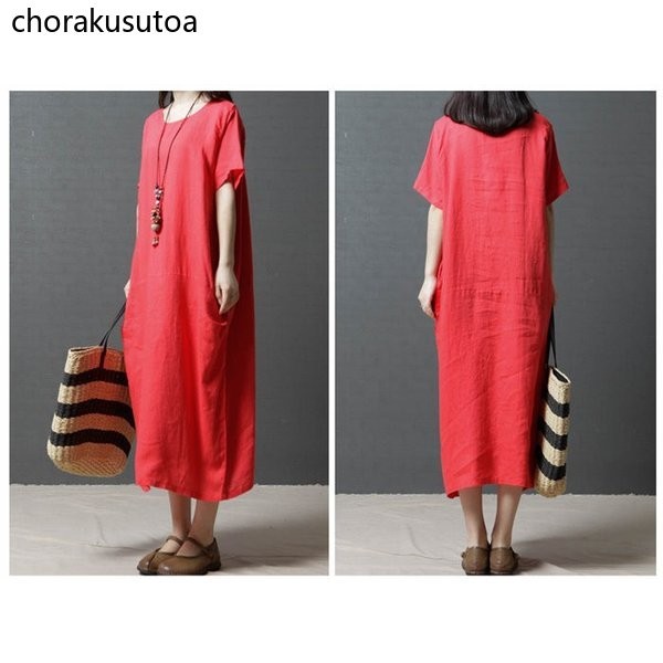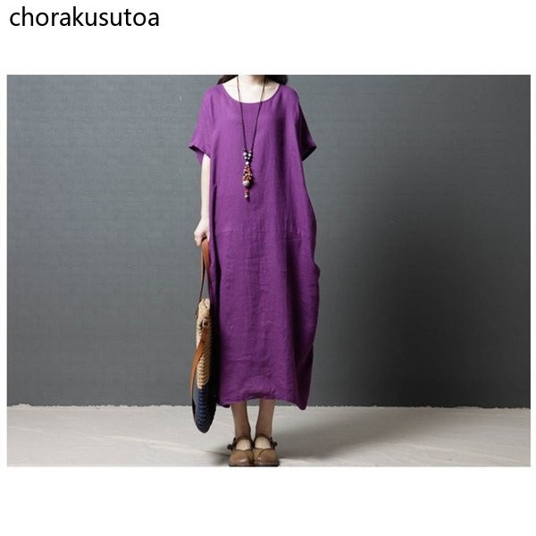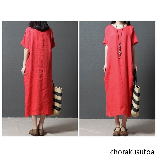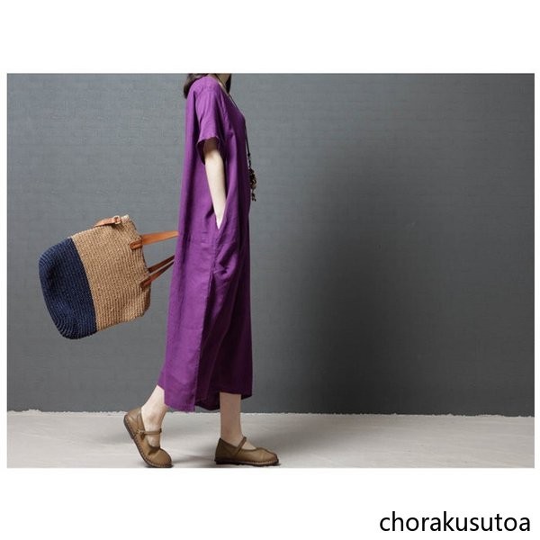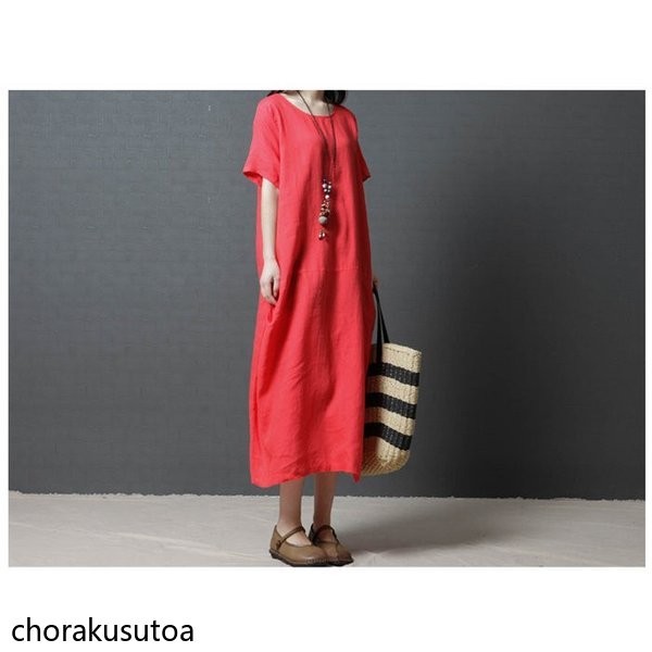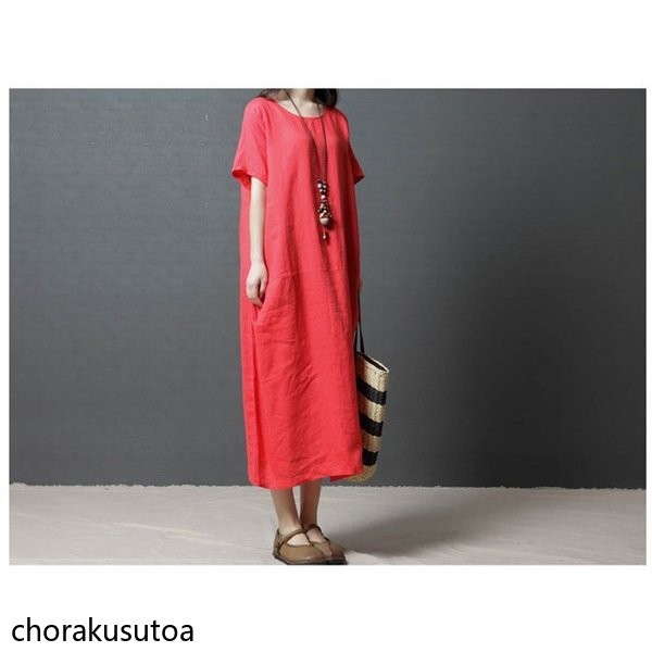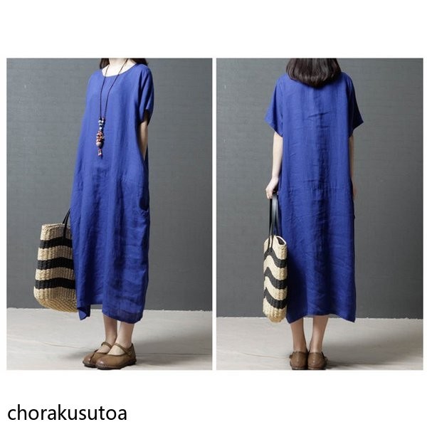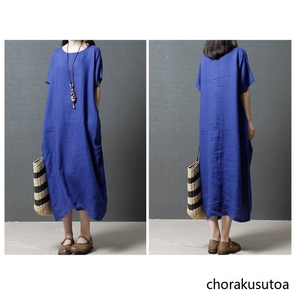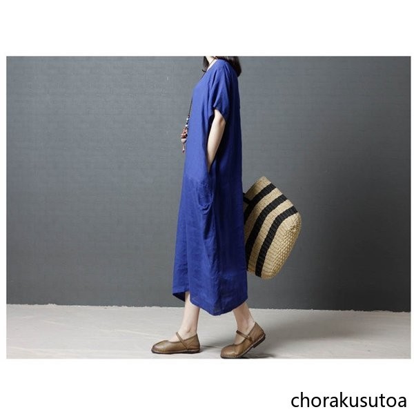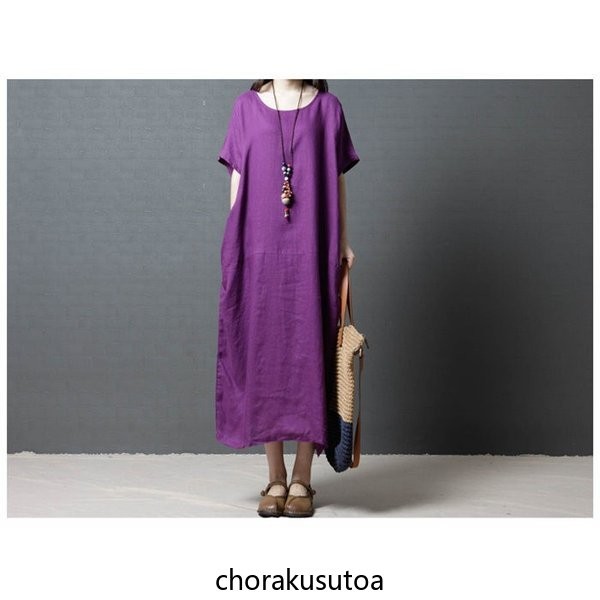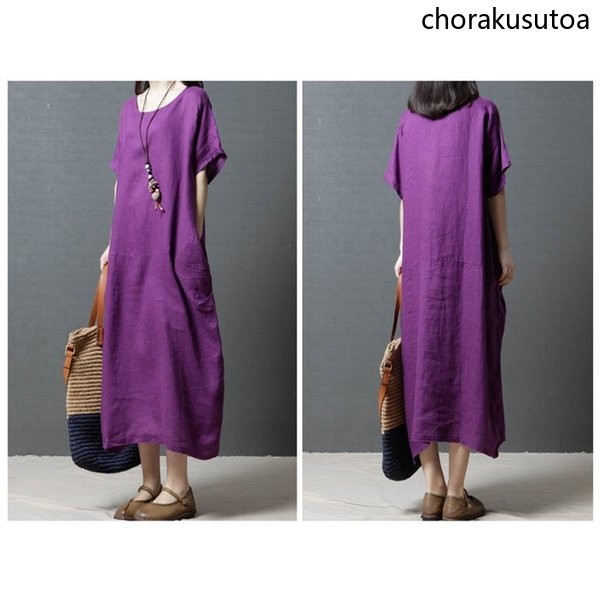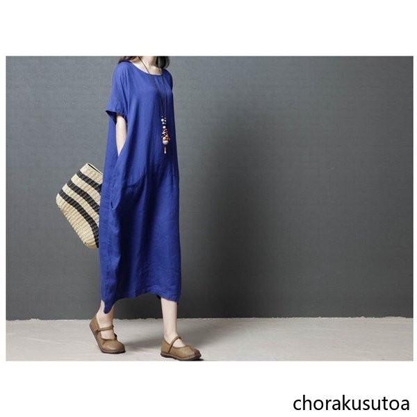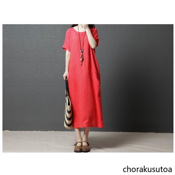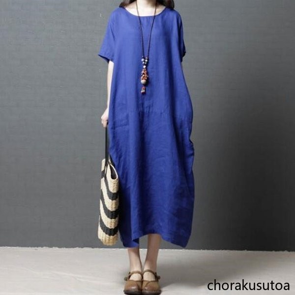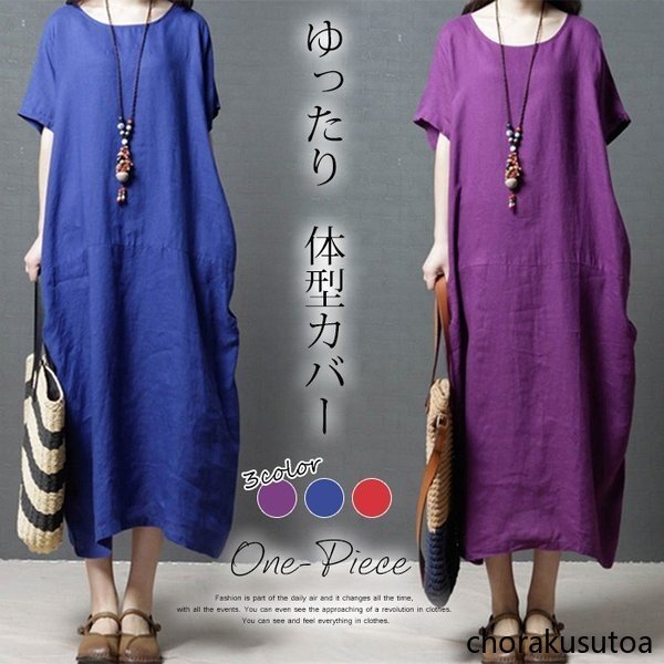 ワンピース コットン混 マキシワンピース 半袖 ロング丈 ワンピース 体型カバー 大きいサイズ 夏 ワンピース 無地 着痩せ 30代40代50代60代