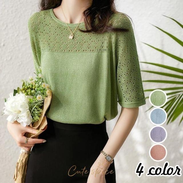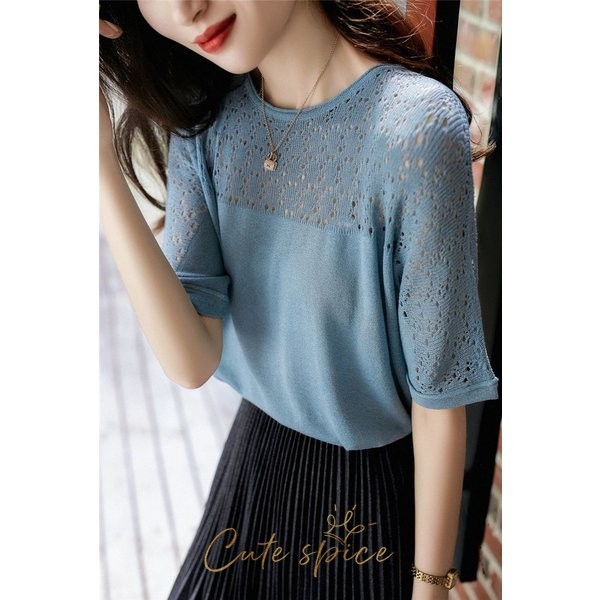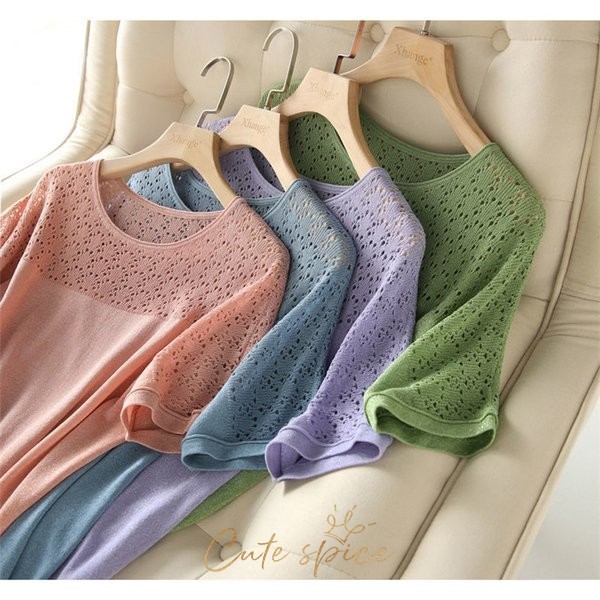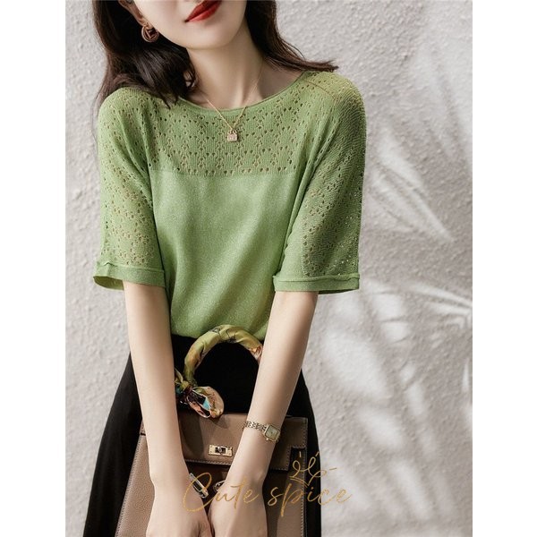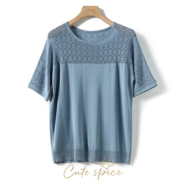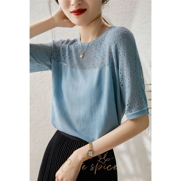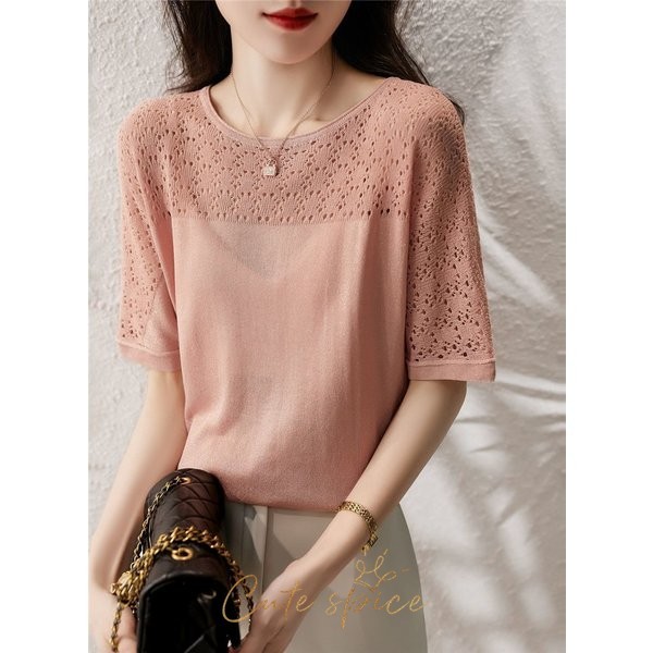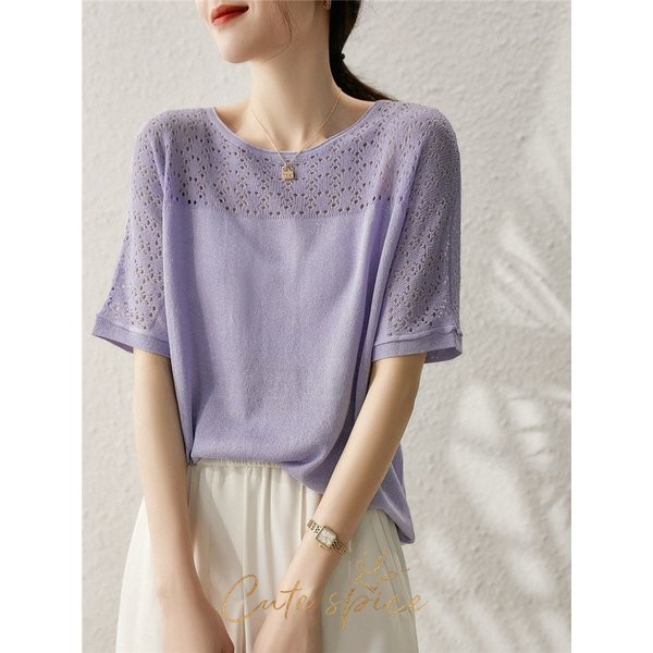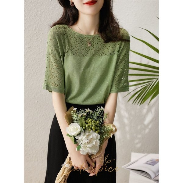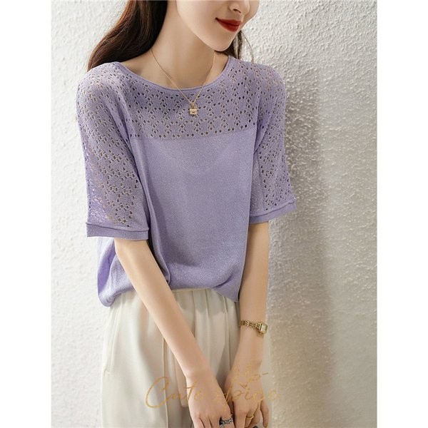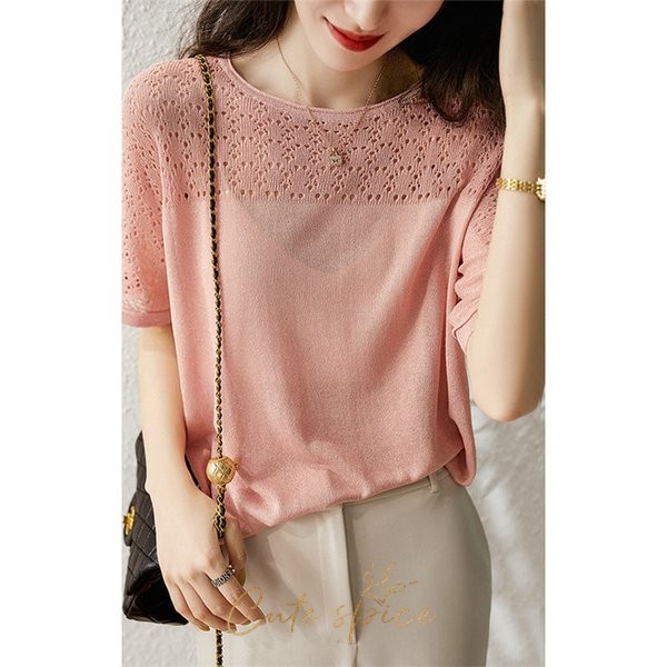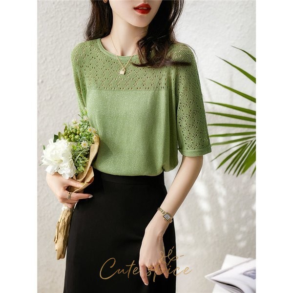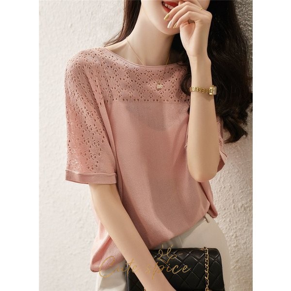 ニットTシャツ トップス レディース きれいめ 40代 春夏 半袖トップス 透かし彫り オシャレ ブラウス 丸首 tシャツ 韓国風 大きいサイズ