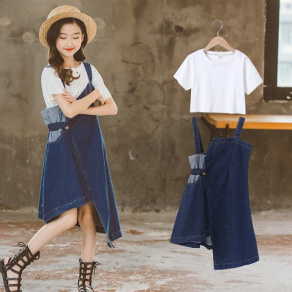 韓国子供服 女の子 セットアップ レジャー おしゃれ 夏服 半袖 Tシャツ * デニムストラップスカート 2点セットキッズ ガールズ 夏着 お出かけ 通学着 海外旅行