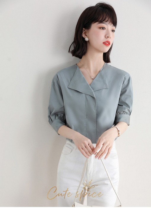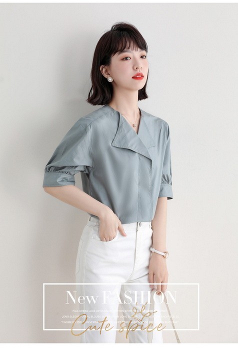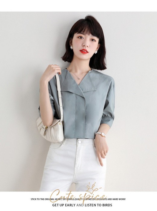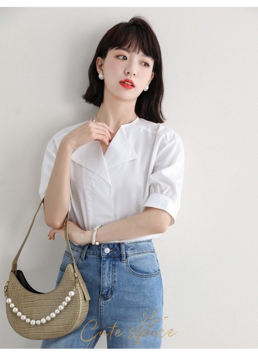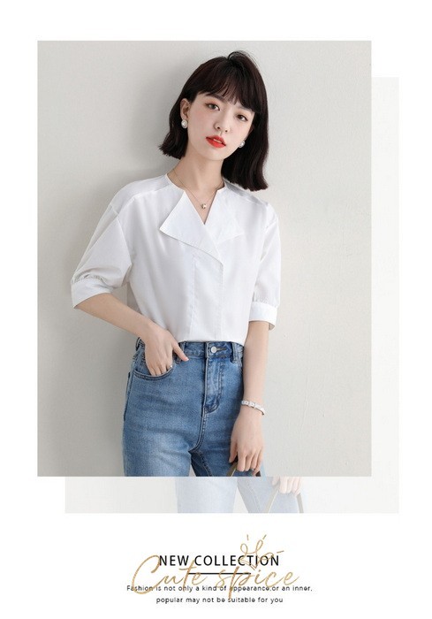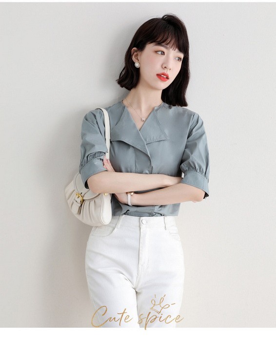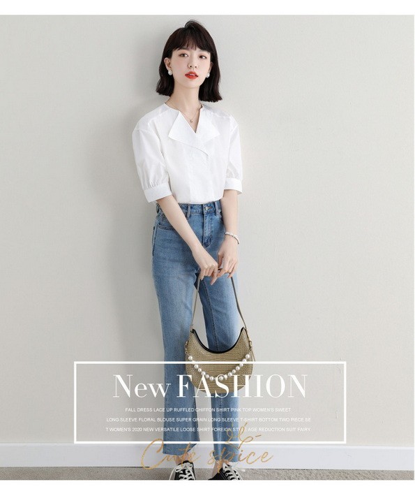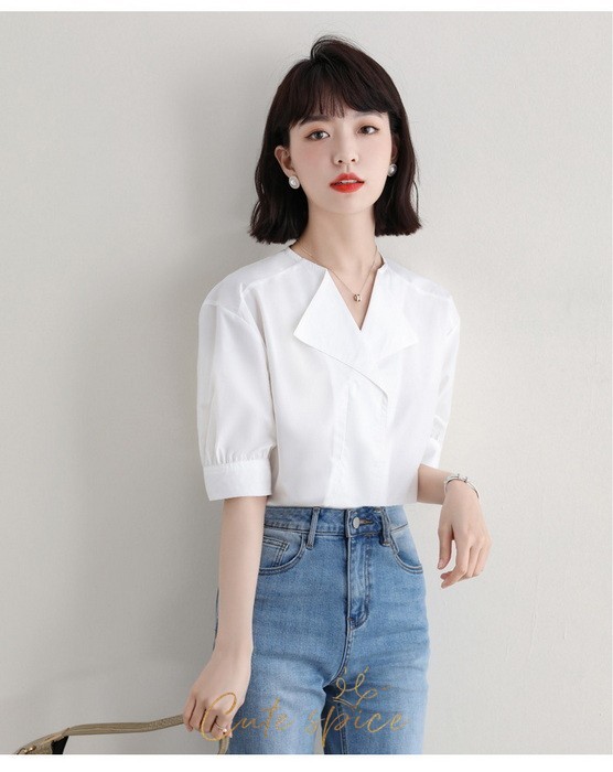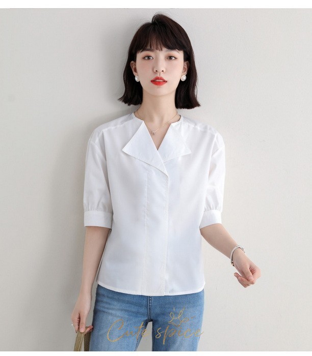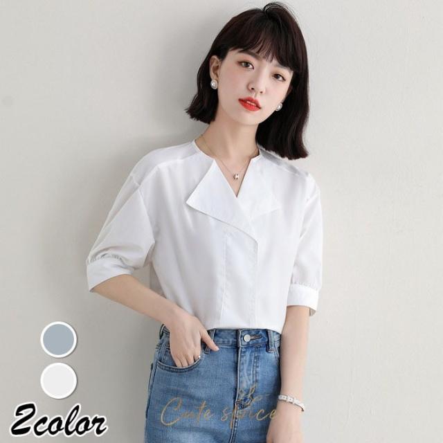 ブラウス レディース 40代 春夏 オシャレブラウス 白ブラウス Vネック パフスリーブブラウス 五分袖トップス 韓国風 大人通勤 OL ゆったりシャツ 30代 50代