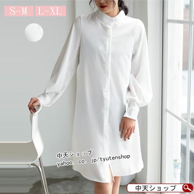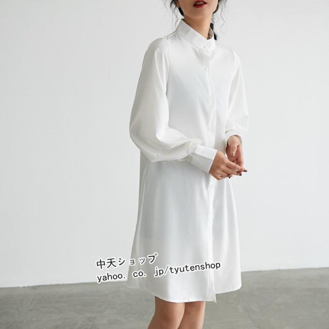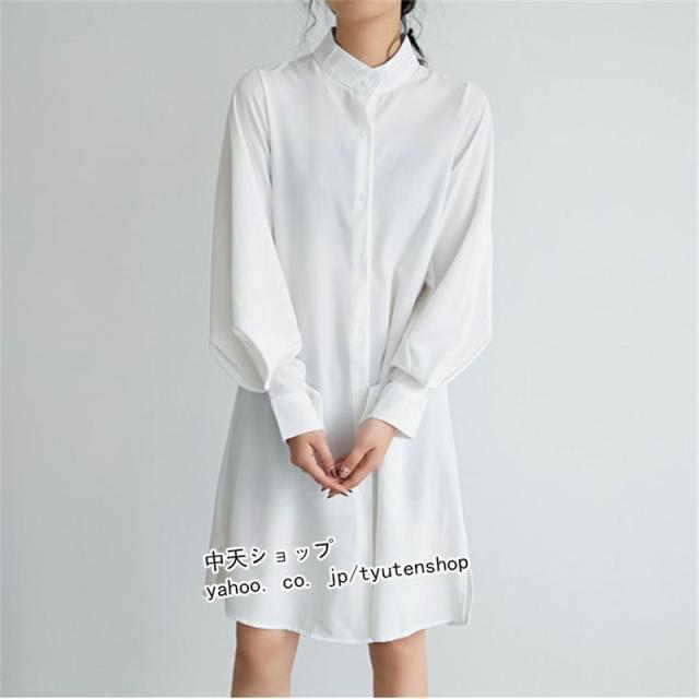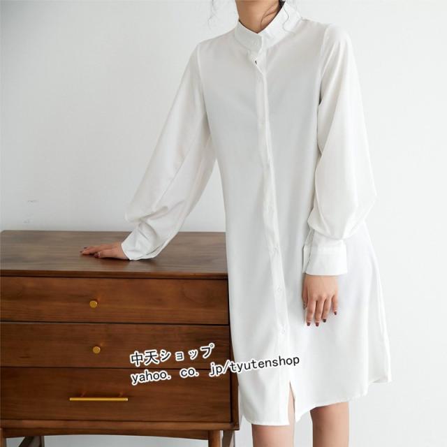 シャツワンピース 膝丈 ワンピース レディース フェミニン 長袖 ゆったり 無地 レトロ パフスリーブ エレガント シフォン 気質 優雅 通勤 着痩せ