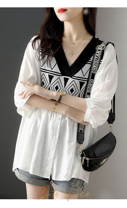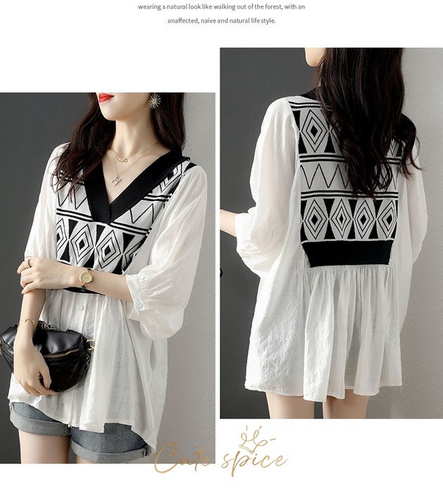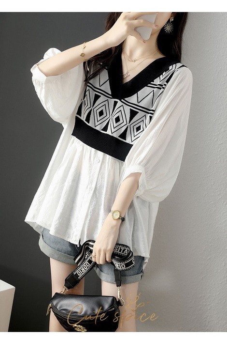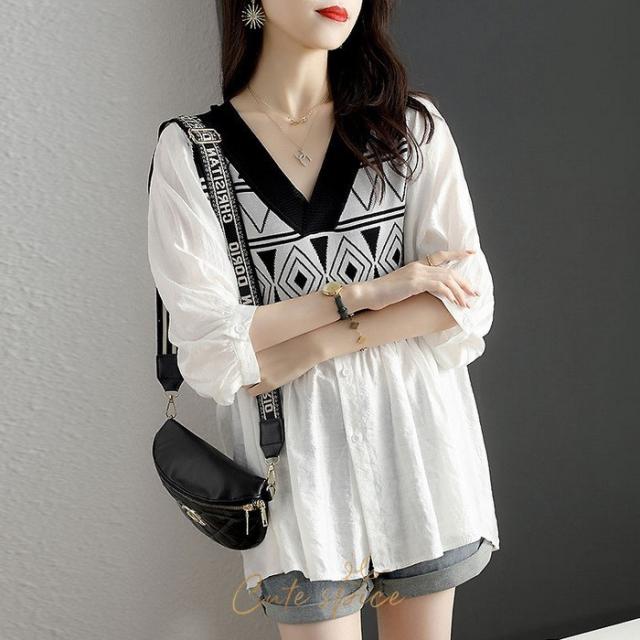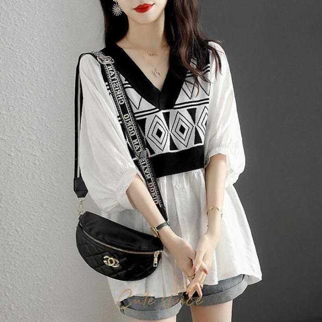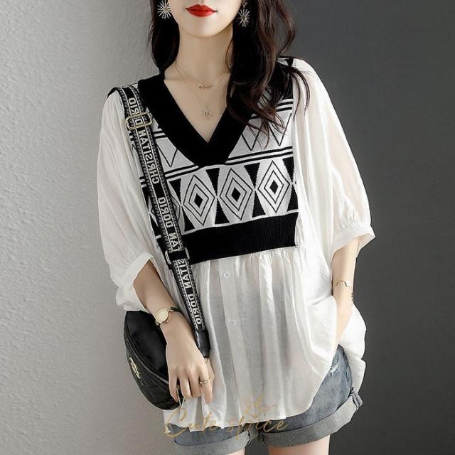 ブラウス レディース 40代 春夏 オシャレブラウス パフスリーブブラウス おしゃれ 幾何柄 リネンブラウス 五分袖トップス 大人上品 通勤 ゆったりtシャツ 30代