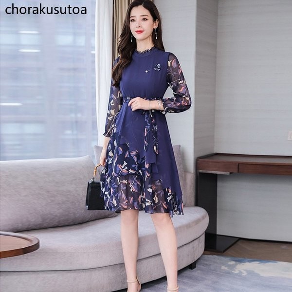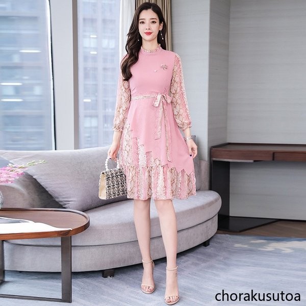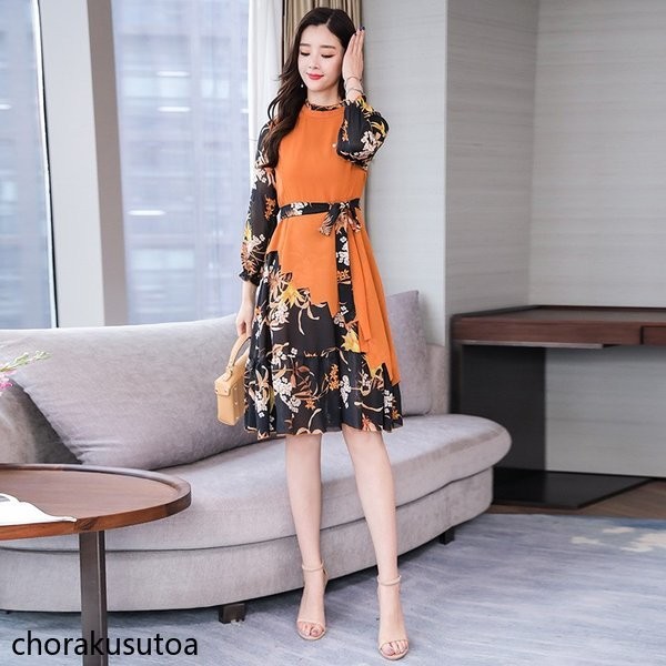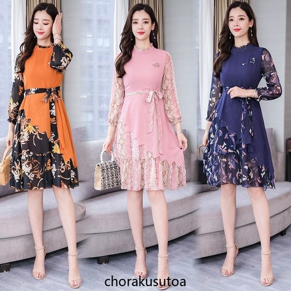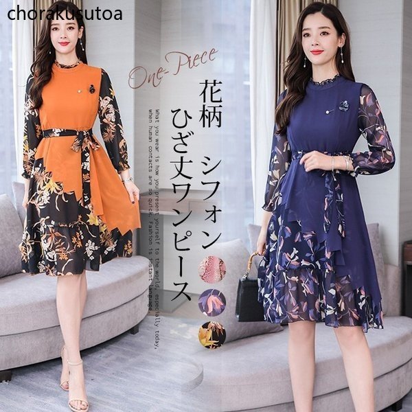 ワンピース レデイース きれいめ 春 長袖 膝丈 シフォンワンピース 花柄 切り替え 着痩せ 上品 大人 おしゃれ 通勤 入園式 卒業式 二次会 ママコーデ 30代 40代