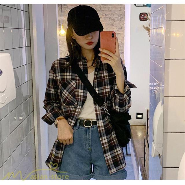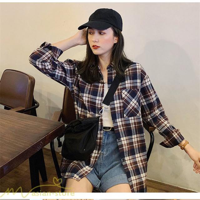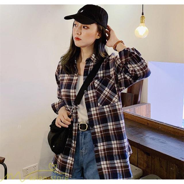 ワイドシャツ レディース チェック柄 フリーサイズ 秋服 トップス シャツ ゆったり ロンシャツ カジュアルシャツ 定番 韓国風 日常感 フォールシャツ 女性着 秋