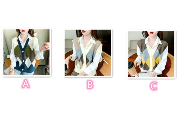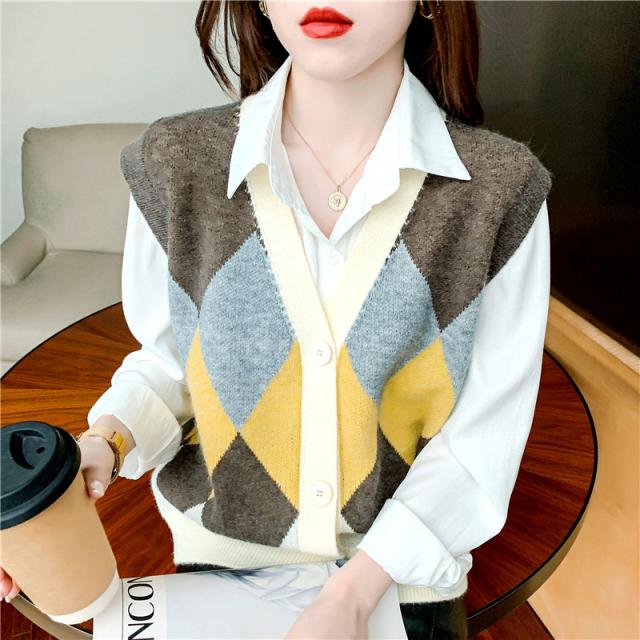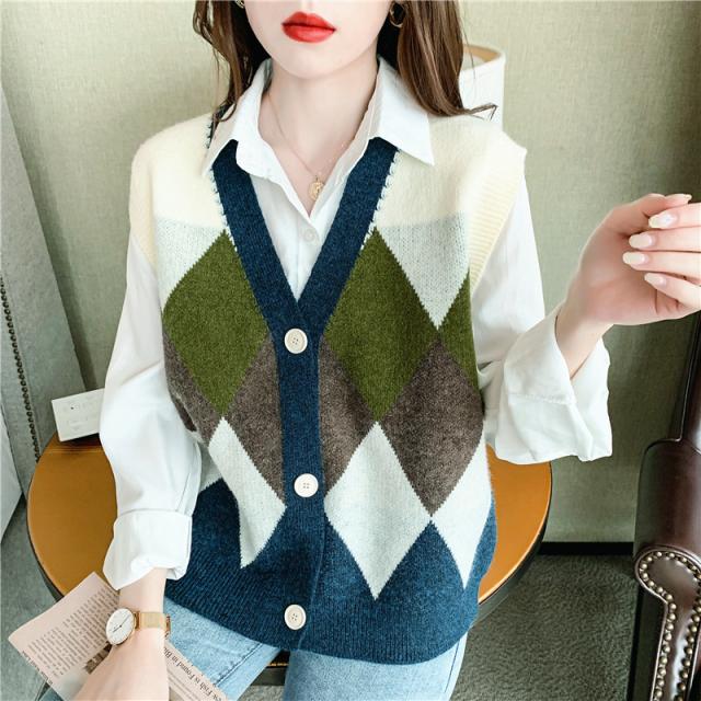 菱形柄ニットベスト ニットベスト レディース ノースリーブニット カーディガン 前開きニット ニット ベスト Vネック ゆったり レイヤード カジュアル 春服 秋服