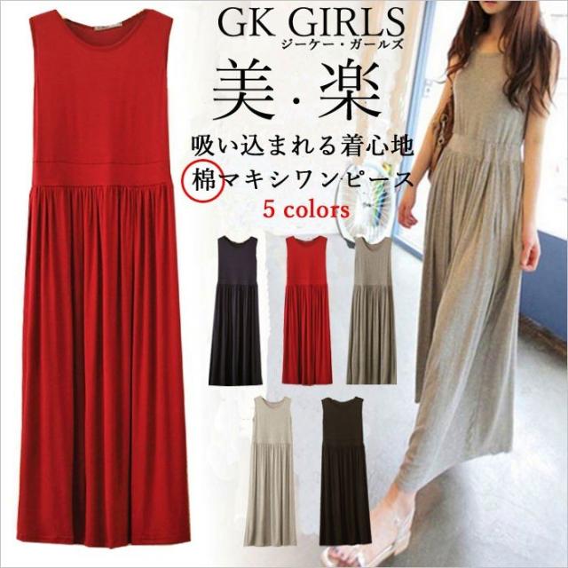 マキシワンピース/ウェストゴム/ウェストシャーリング/ノースリーブ/ロングスカート/Vネック/