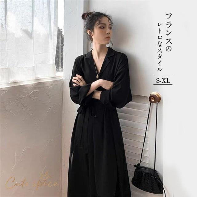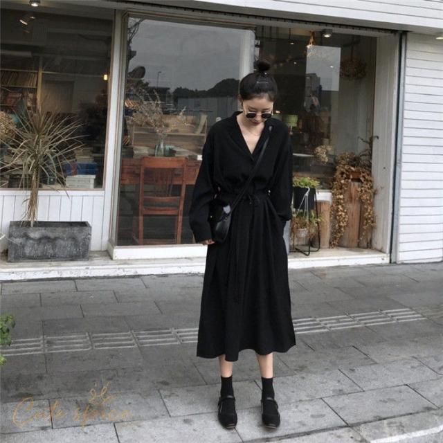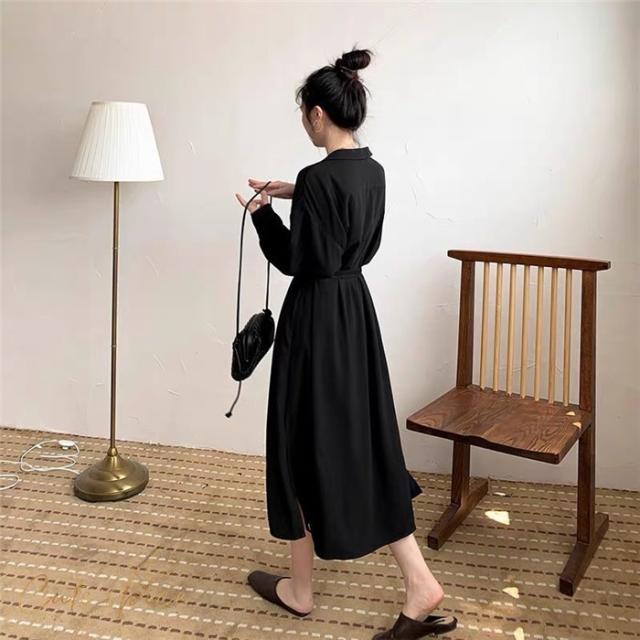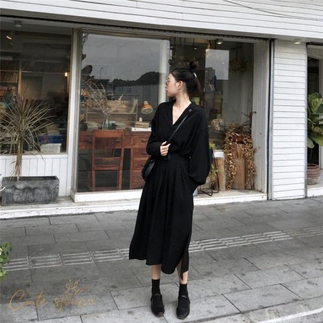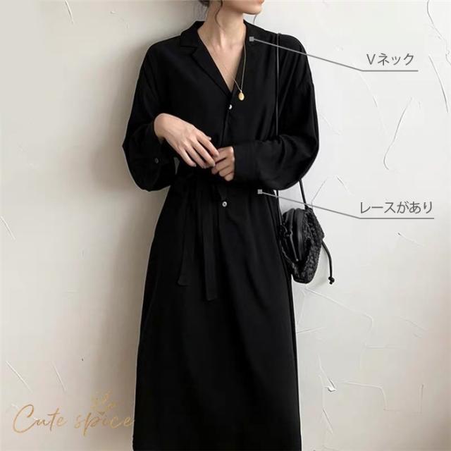 ワンピース レディース ロング丈 長袖 Vネックシャツワンピース Aライン お洒落 ゆったり 秋 新作 30代 40代 着痩せ 韓国風 通勤 入学式 ボタン付き