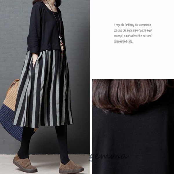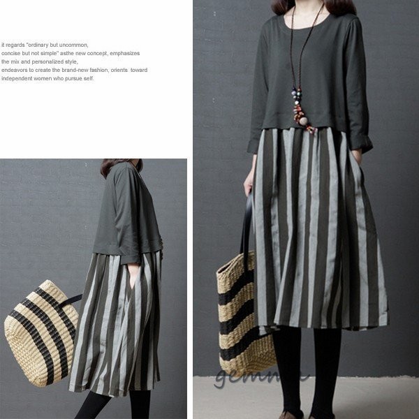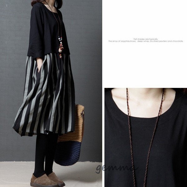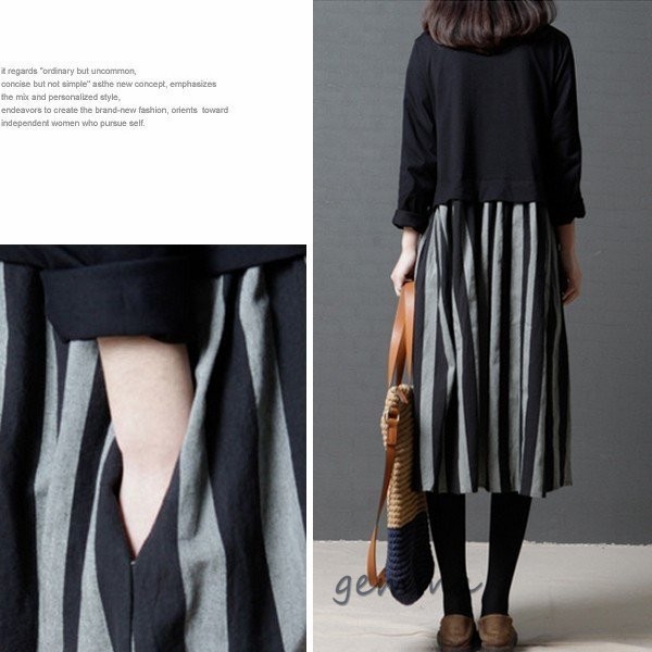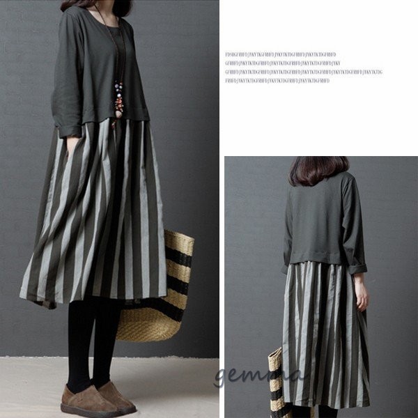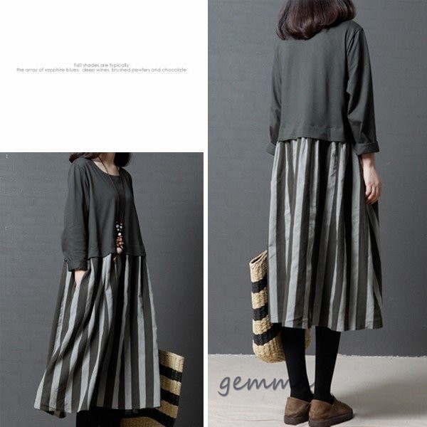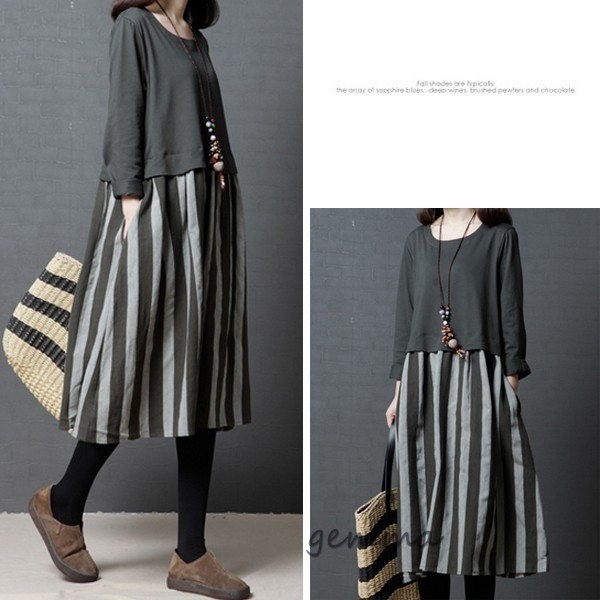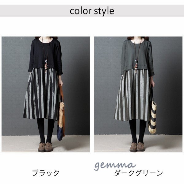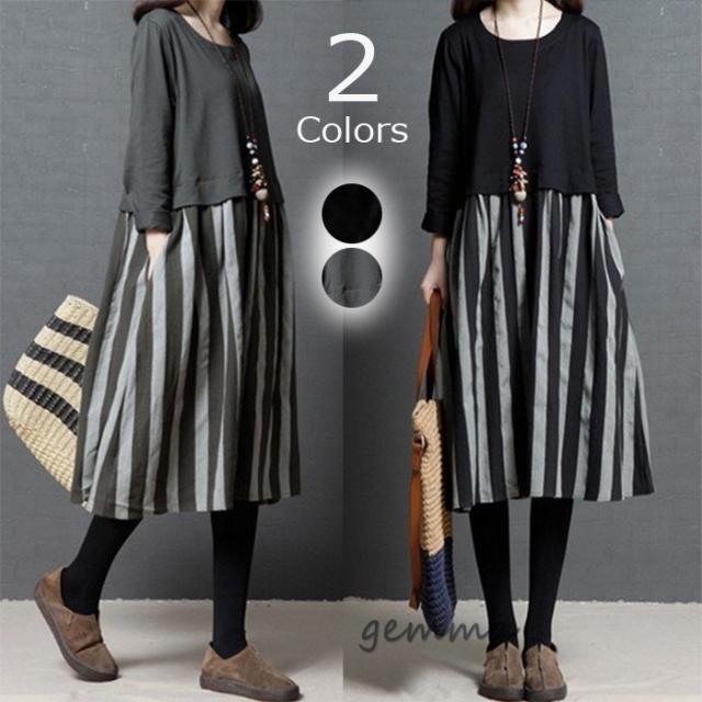 レディース 森ガール ワンピース 長袖 ゆったり ナチュラル 切替 体型カバー ミディアム丈 膝丈 Aライン ストライプ 大きいサイズ 2カラー 4サイズ