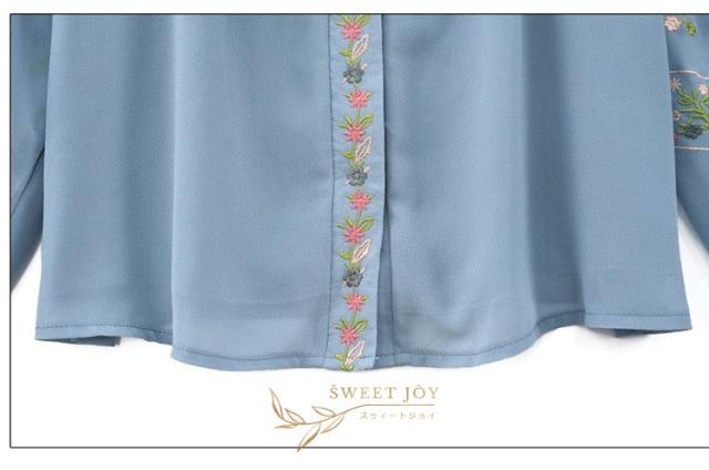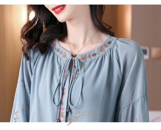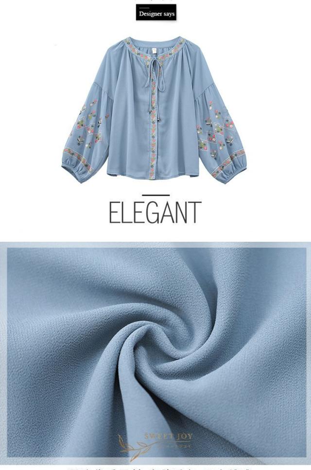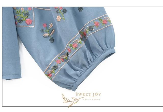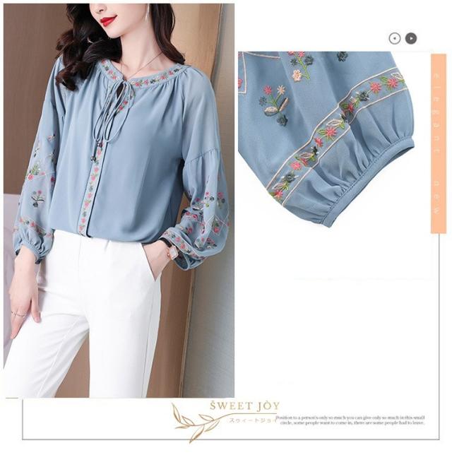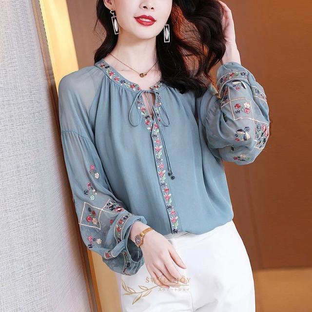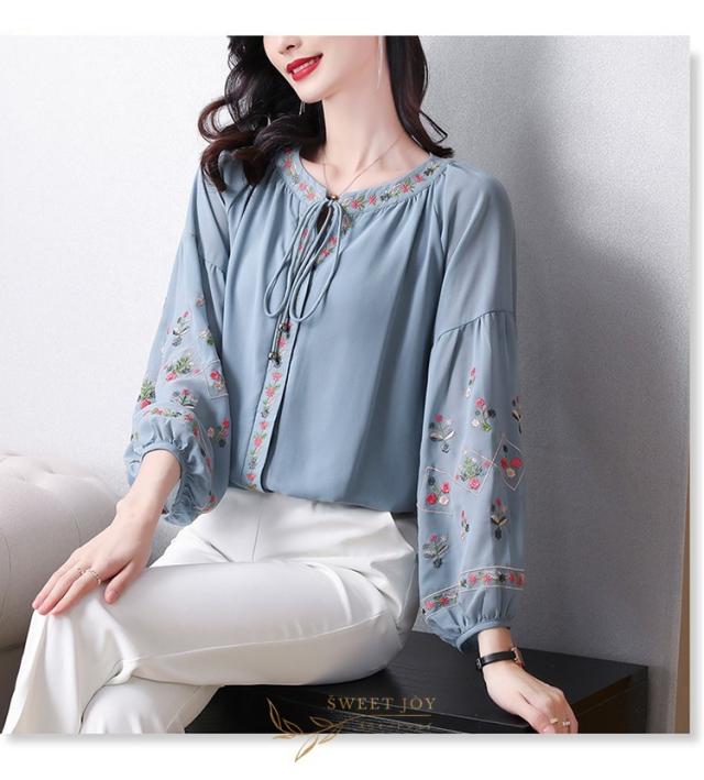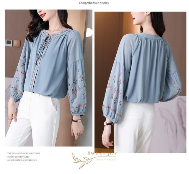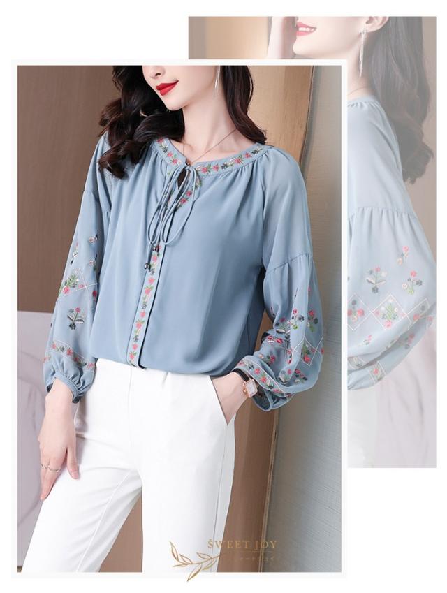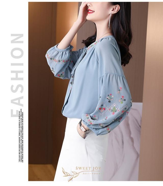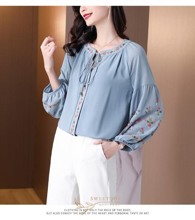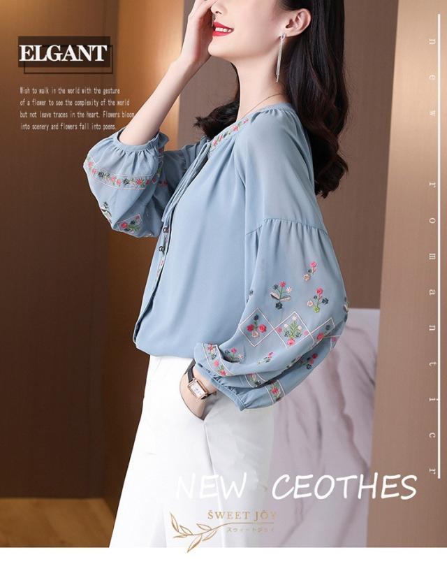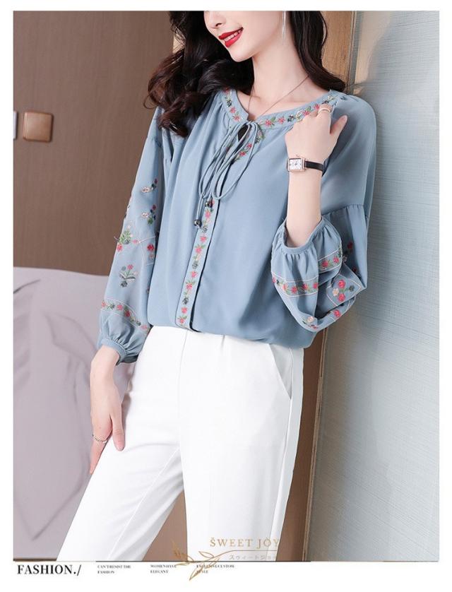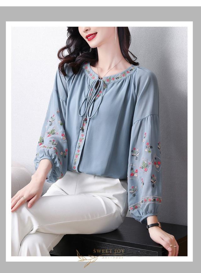 ブラウス レディース 40代 春夏秋新作 オシャレブラウス 花刺繍シャツ 長袖トップス リボン パフスリーブブラウス 大人 通勤 ゆったり シャツ30代 50代