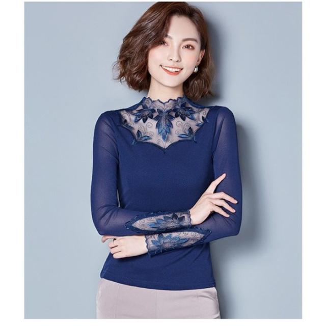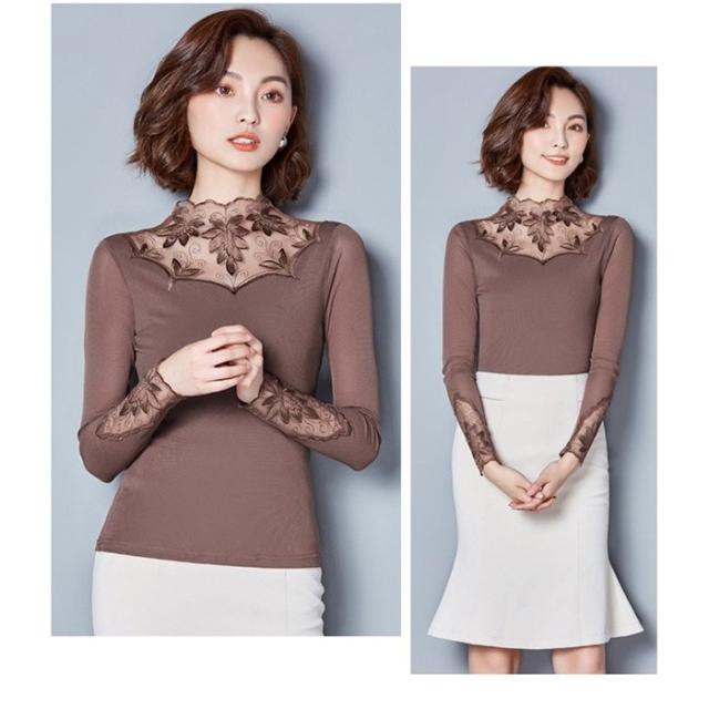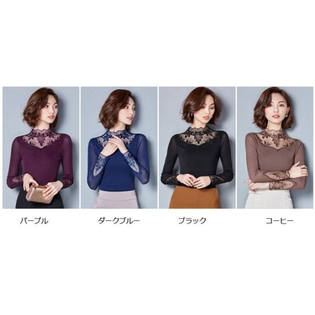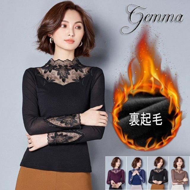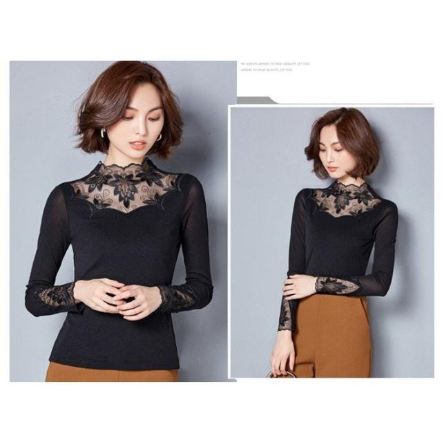 トップス レディース 裏起毛 ブラウス 長袖 丸襟 タートルネック レース 細身 保温 厚手 インナー 秋冬