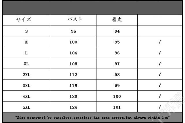 | サイズについての説明 | S:着丈94 バスト96 M:着丈95 バスト100 L:着丈96 バスト104 XL:着丈97 バスト1082XL:着丈98 バスト1123XL:着丈99 バスト1164XL:着丈100 バスト1205XL:着丈101 バスト124 |