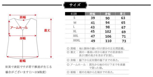 | サイズについての説明 | サイズ:Sサイズ :着丈約63cm /身幅約90cm /肩幅約39cmMサイズ:着丈約65cm /身幅約94cm /肩幅約41cmLサイズ:着丈約67cm /身幅約98cm /肩幅約43cmXLサイズ:着丈約69cm /身幅約102cm /肩幅約45cmXXLサイズ :着丈約71cm /身幅約106cm /肩幅約47cm |