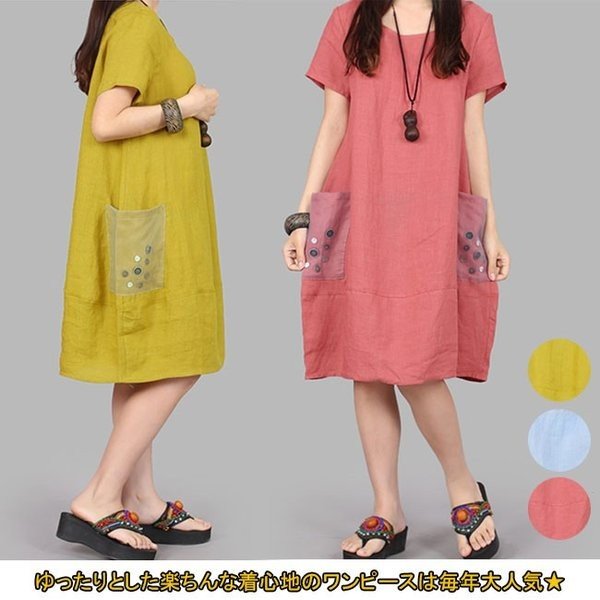 ワンピース サマー ミディアム丈 サックワンピース ビッグワンピース 綿麻ワンピース リネンワンピ ナチュラル風ワンピ 大きいサイズ 無地