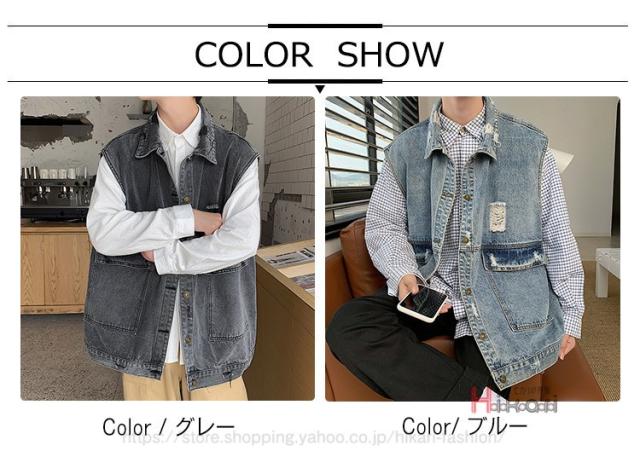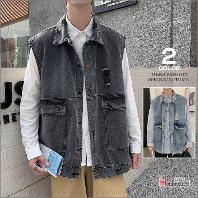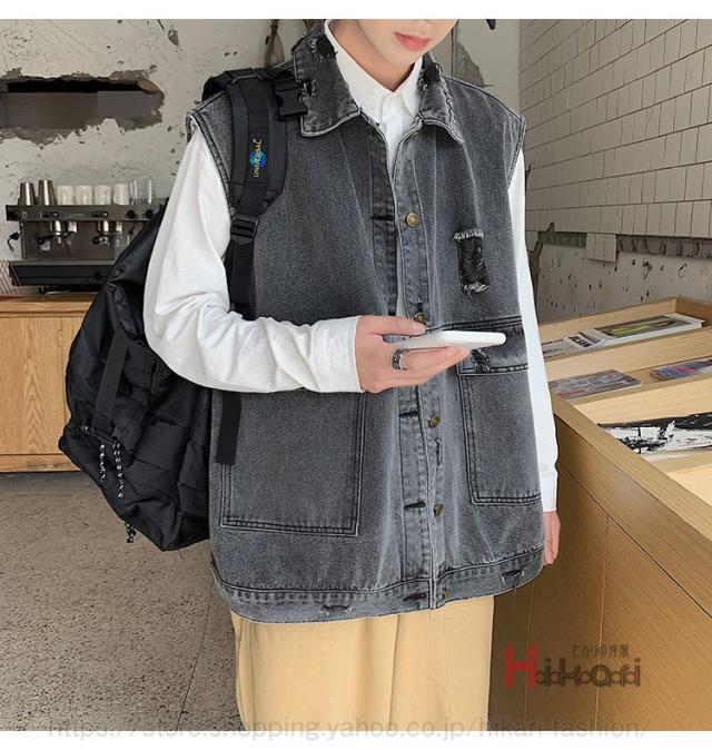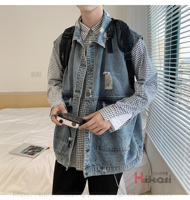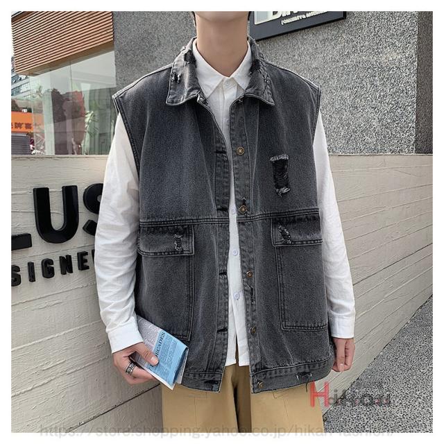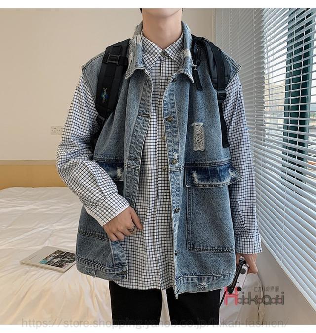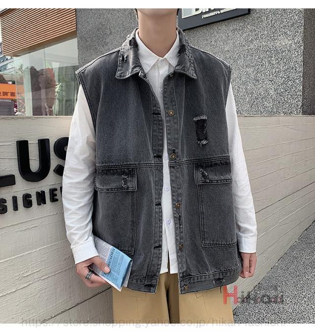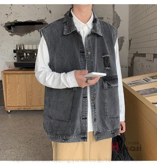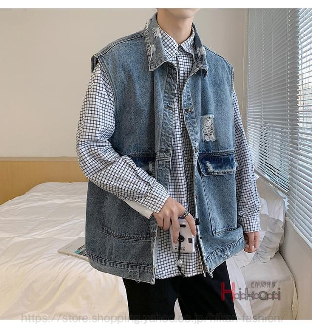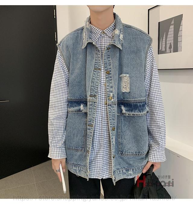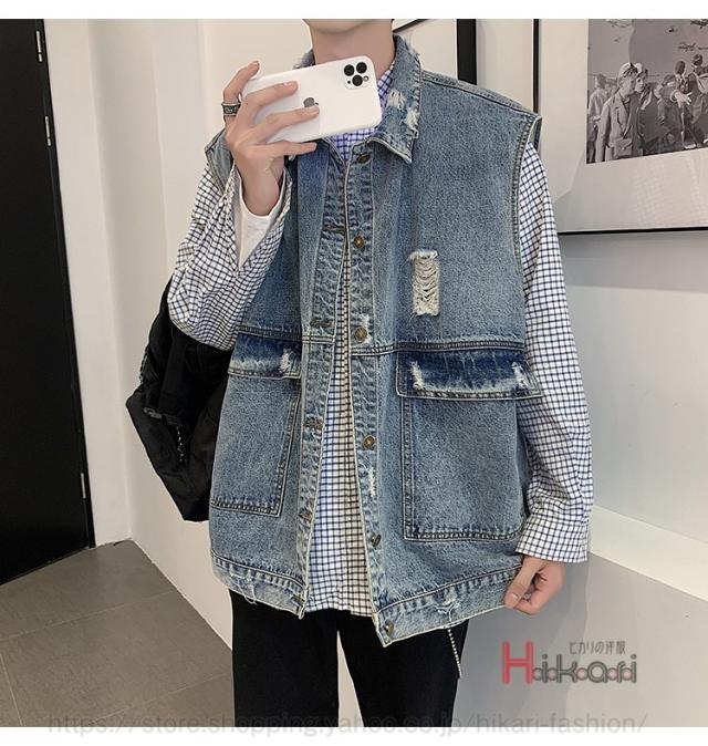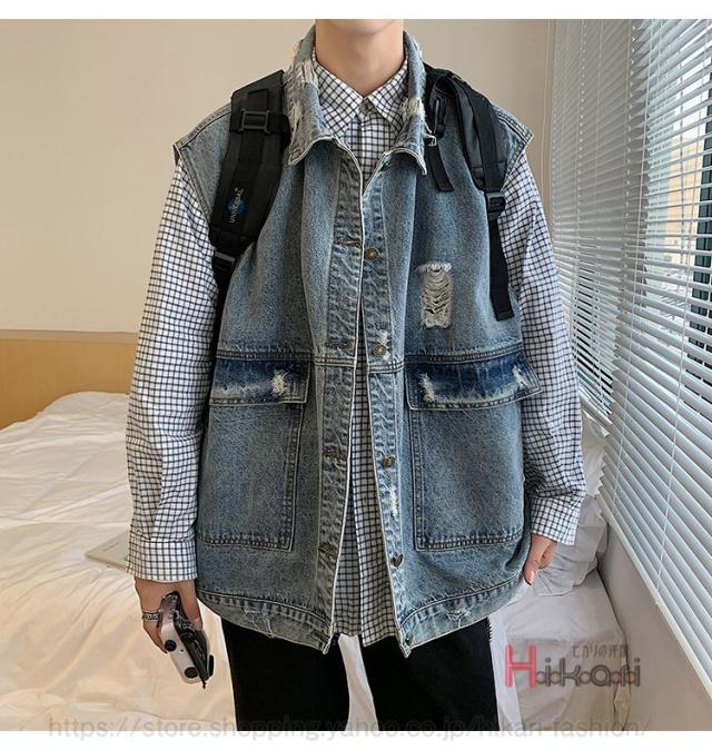 ビッグシルエット デニムベスト メンズ デニム ベスト ノースリーブ ジャケット ダメージ加工 アウター かっこいい