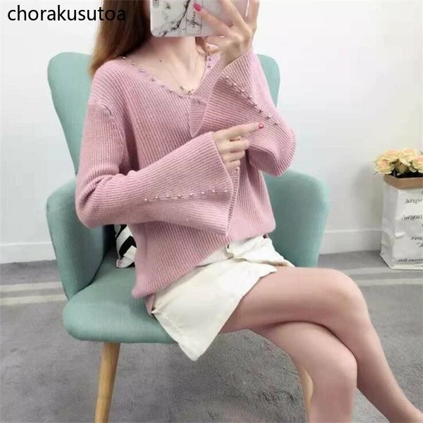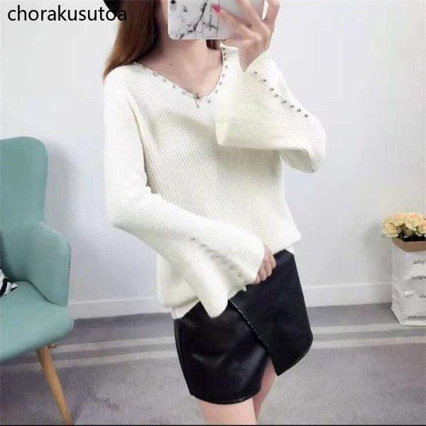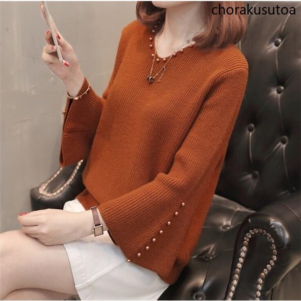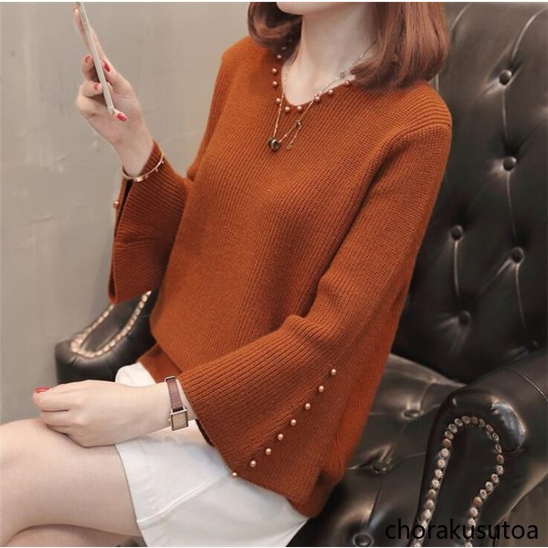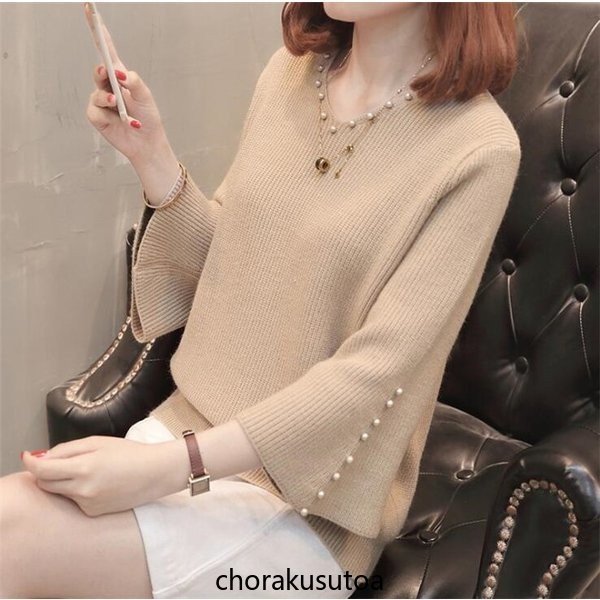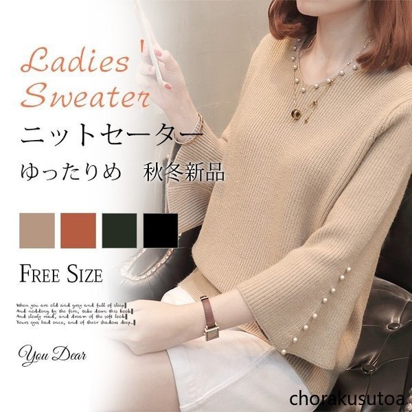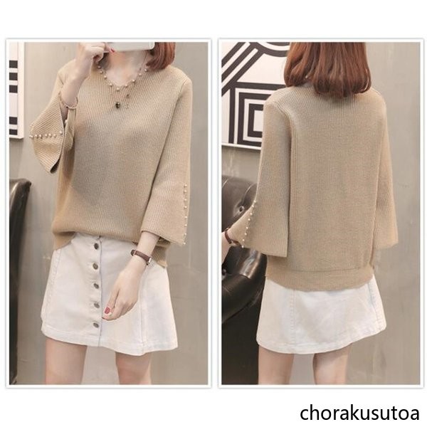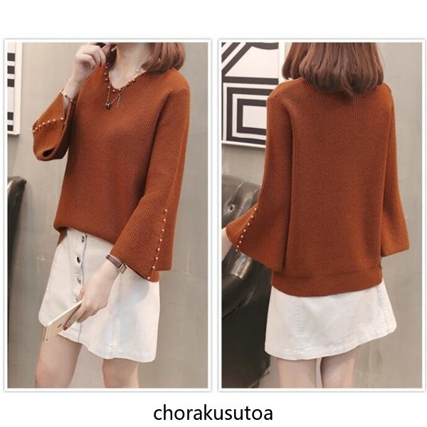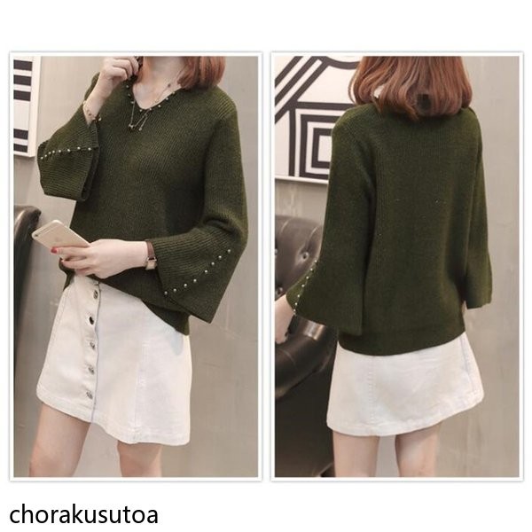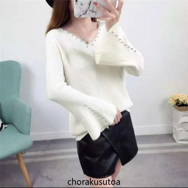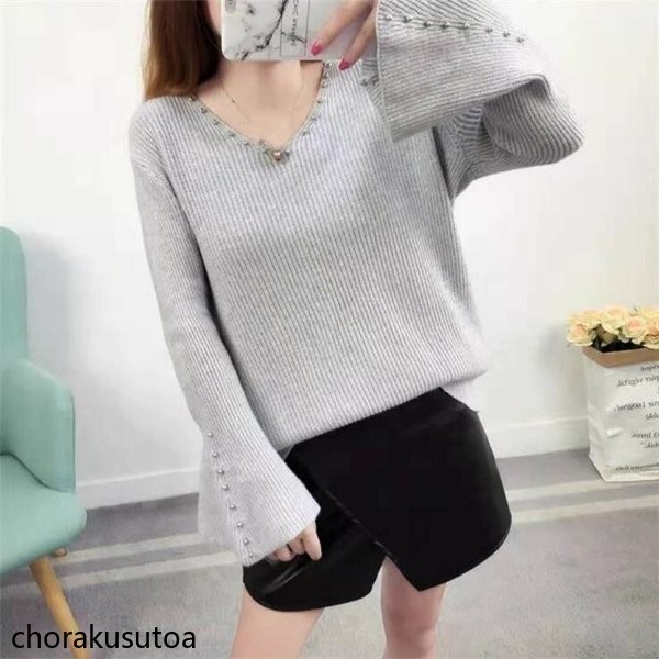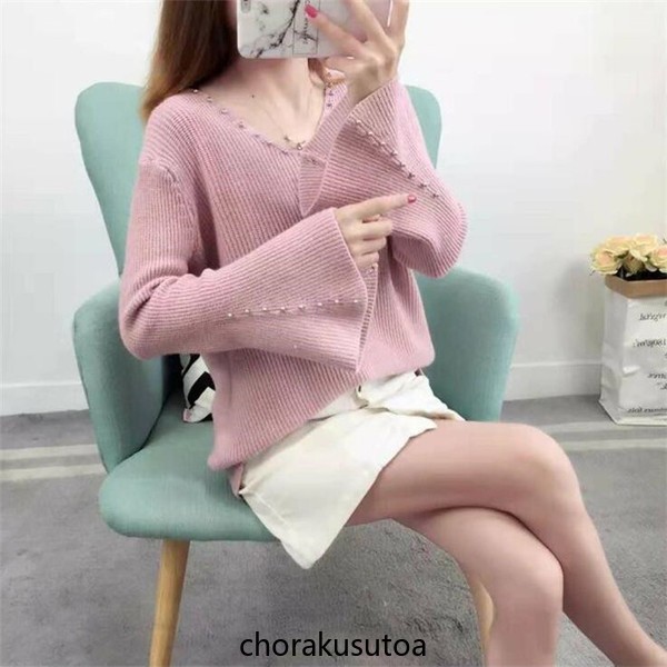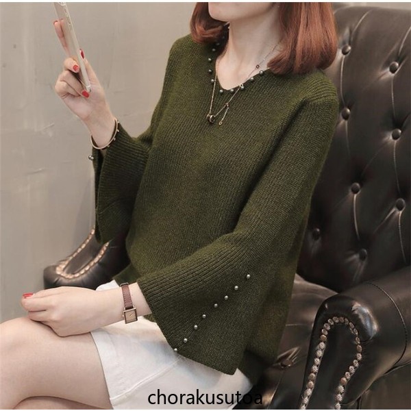 ニット レディース リブニット Vネック トップス ニットセーター 長袖 パール飾り キレイめ 無地 秋 冬 ニットウェア 洗える セーター 20代 30代 40代