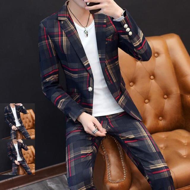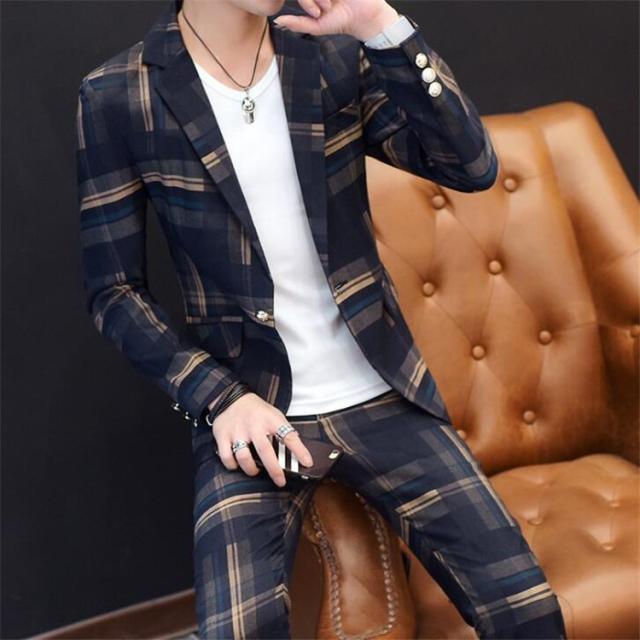 シングルスーツ 結婚式ビジネス紳士服チェック柄 2点セットテーラードジャケットスリム細身スラックス