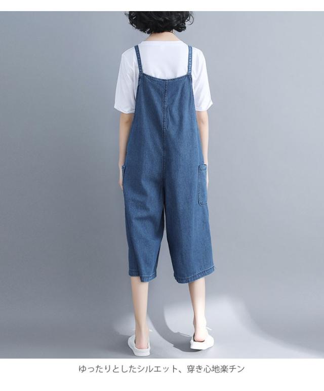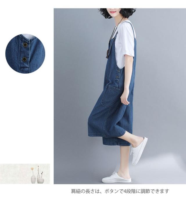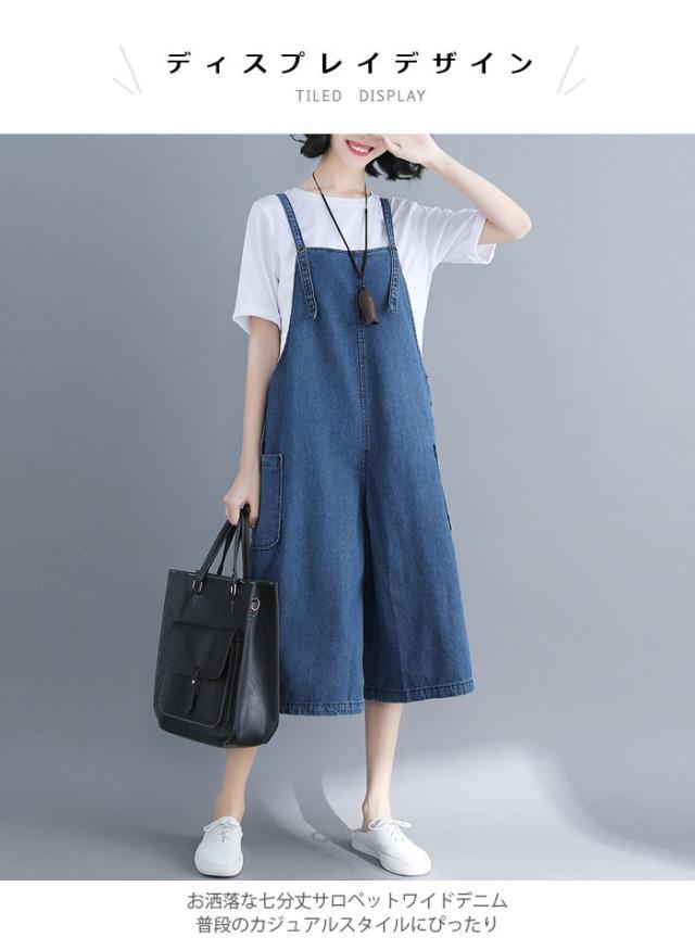 デニム レディース サロペット ワイドパンツ 七分丈パンツ デニムサロペット ゆったり ガウチョパンツ ボートネック お洒落 カジュアル ボトムス