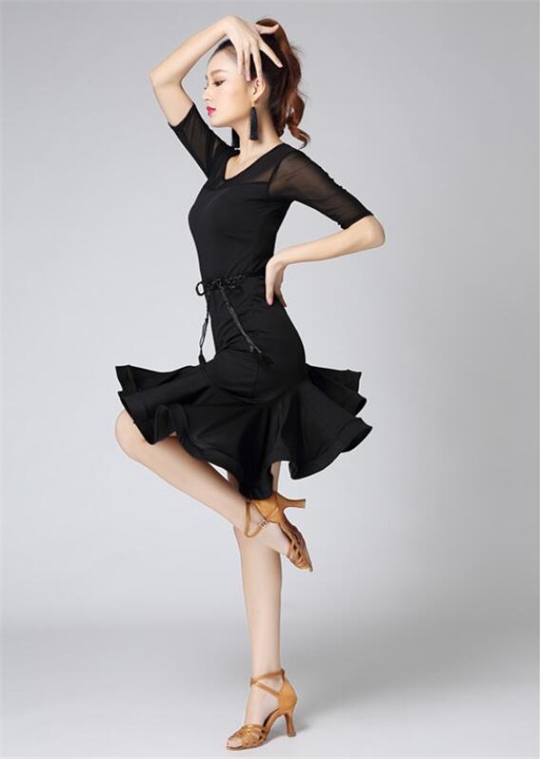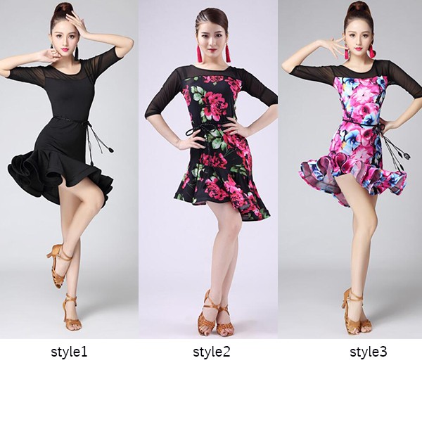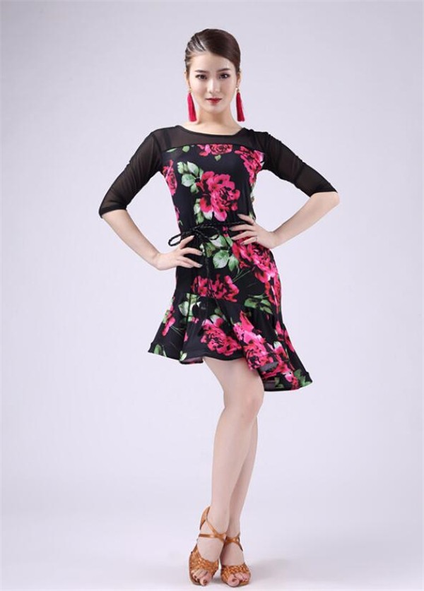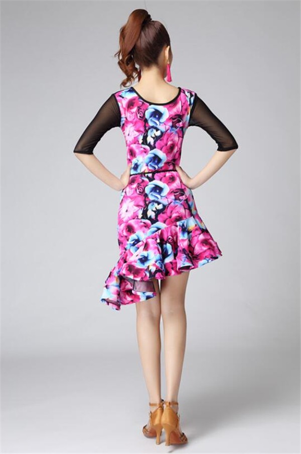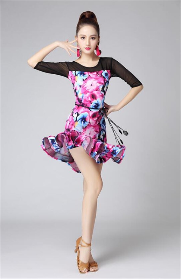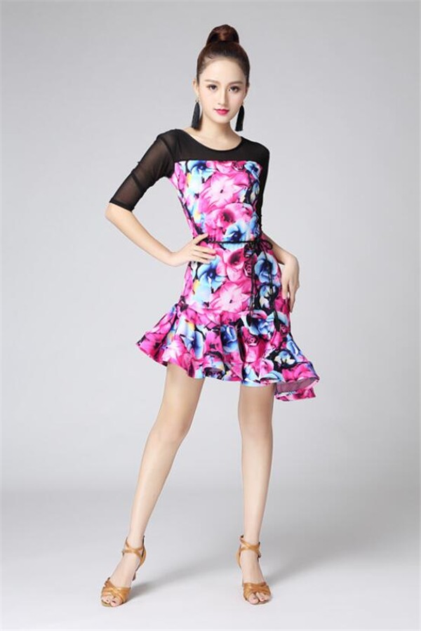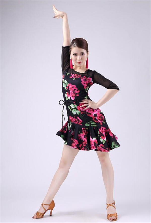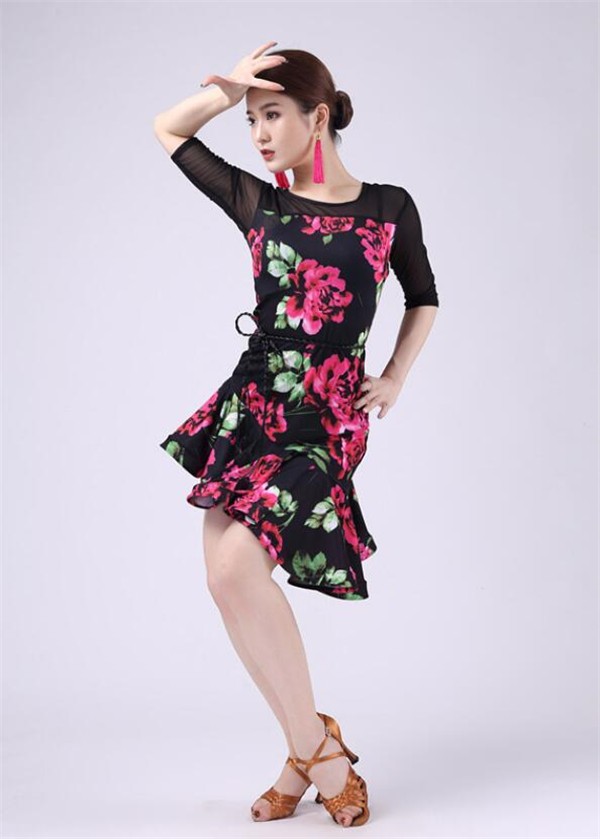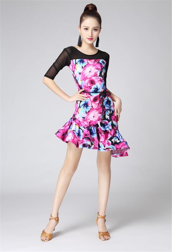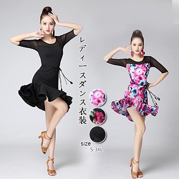 レディースダンス衣装 ラテンダンス衣装 社交ラテン 花柄 フレア裾ワンピース ラテンドレス ステージ衣装 レッスンウェア ダンスウェア おしゃれ