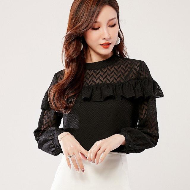 ブラウス レディース シフォンブラウス 着痩せ シャツ ブラック 秋物 フリル 長袖 丸首 トップス 透け感 通勤 ビジネス